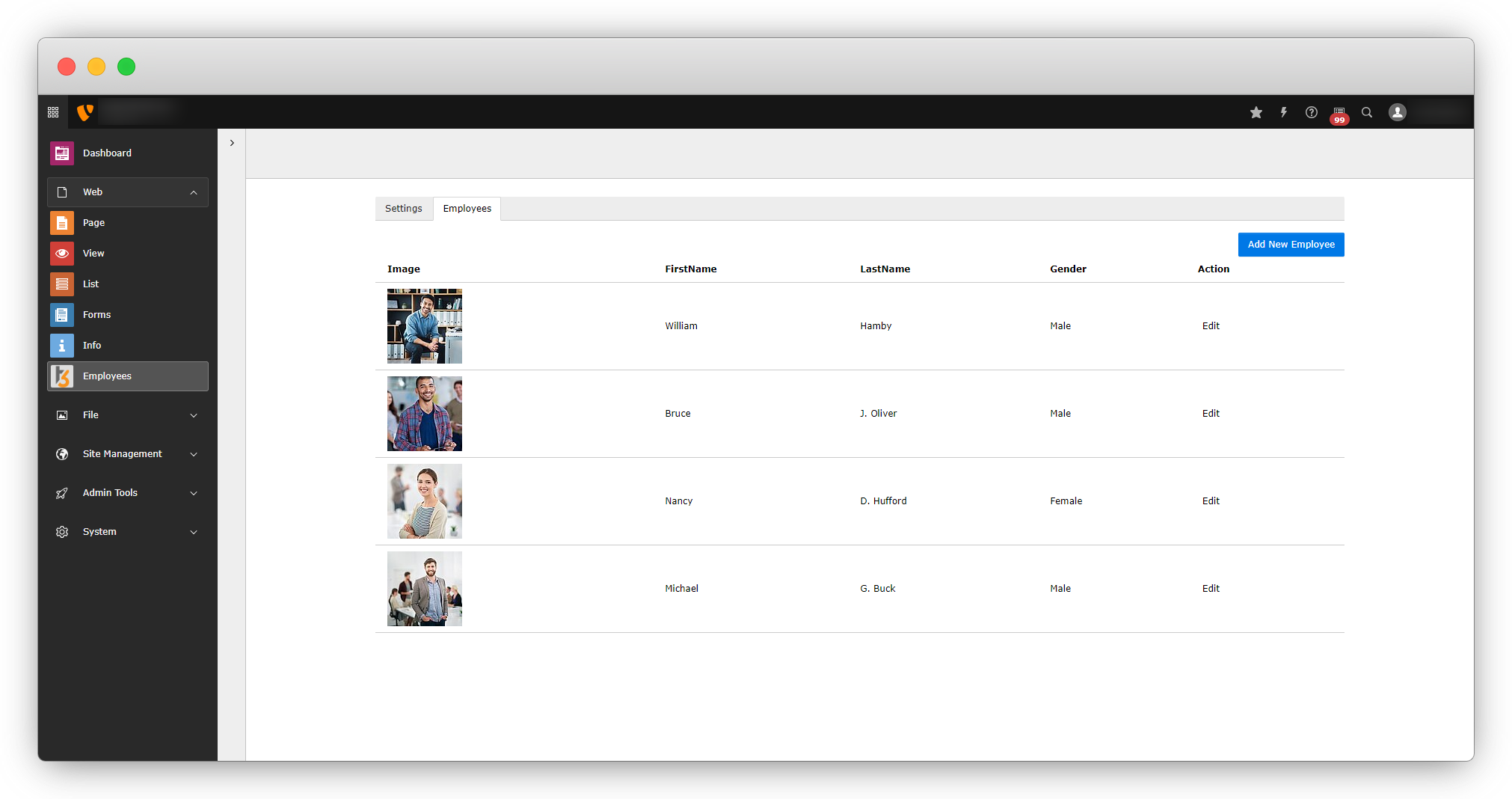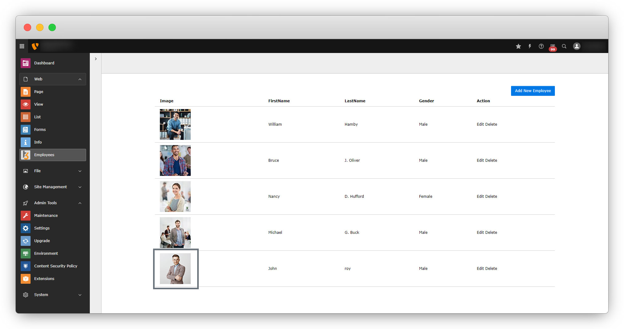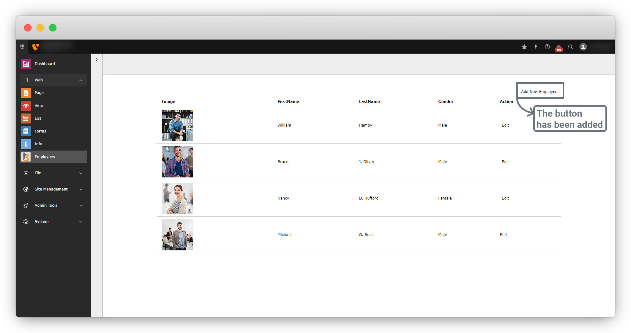 6. After adding the action new, flush the cache and go to the back-end module and you will see the “Add New Employee” button is linked now.