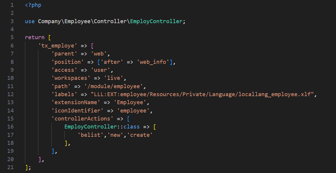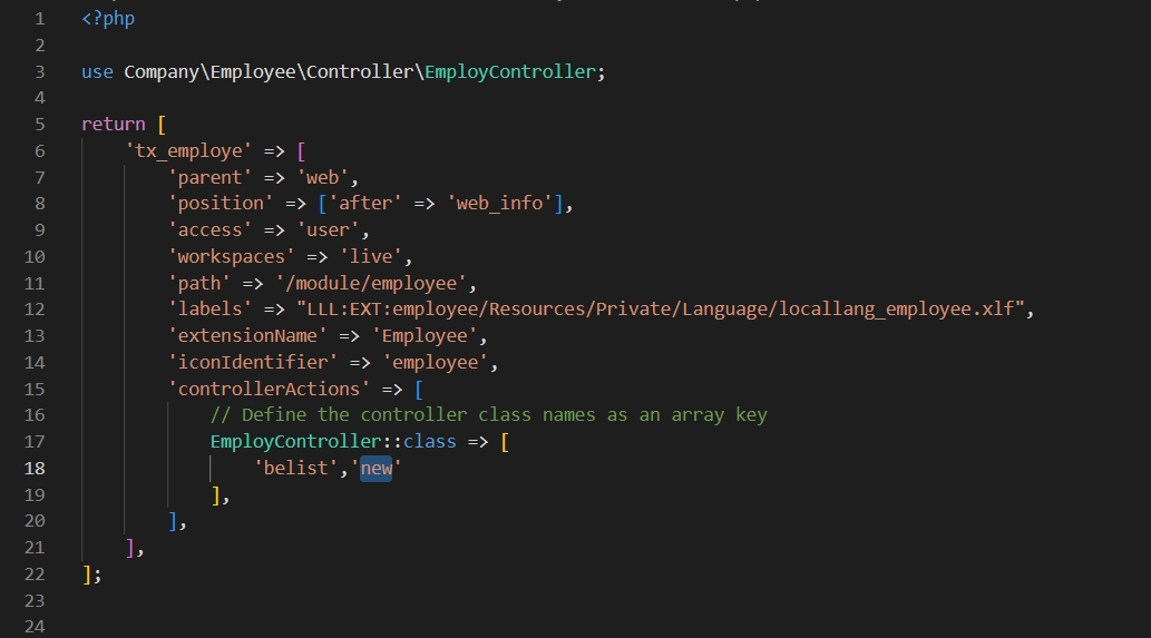 16. After creating the action, add the action in employeeConfigurationBackendModules.php file to allow it for the backn-end module.