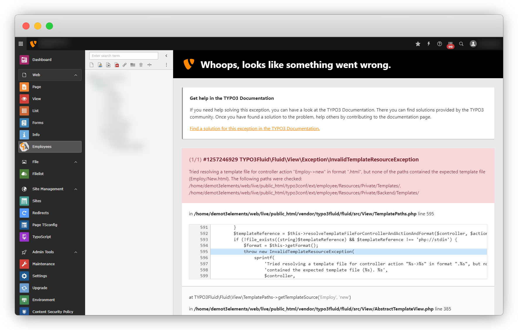 8. The above error indicates that the template file is missing to add the new employee. Let’s create the template file for the action new, and the file path will be: employeeResourcesPrivateBackendTemplatesEmployNew.html