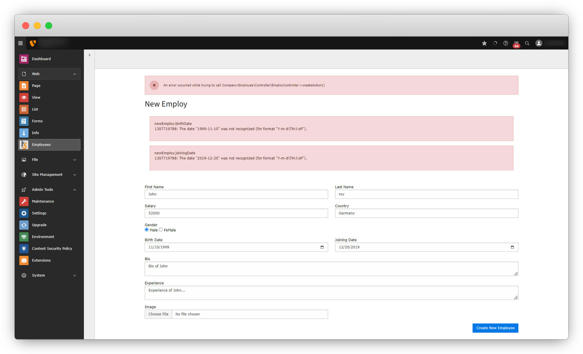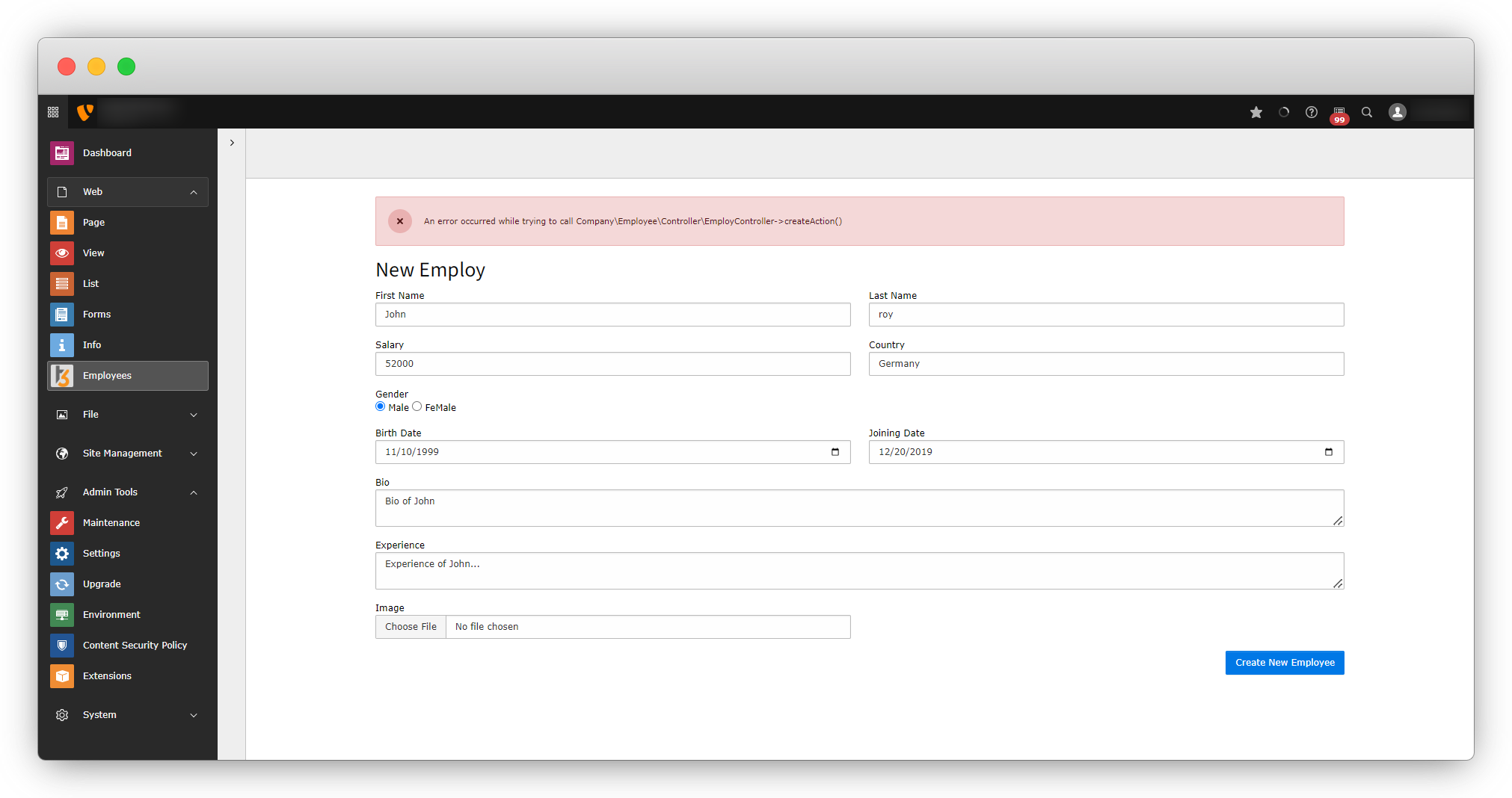 7. Click on the button “Add New Employee” and you will see an error as seen in the screenshot below