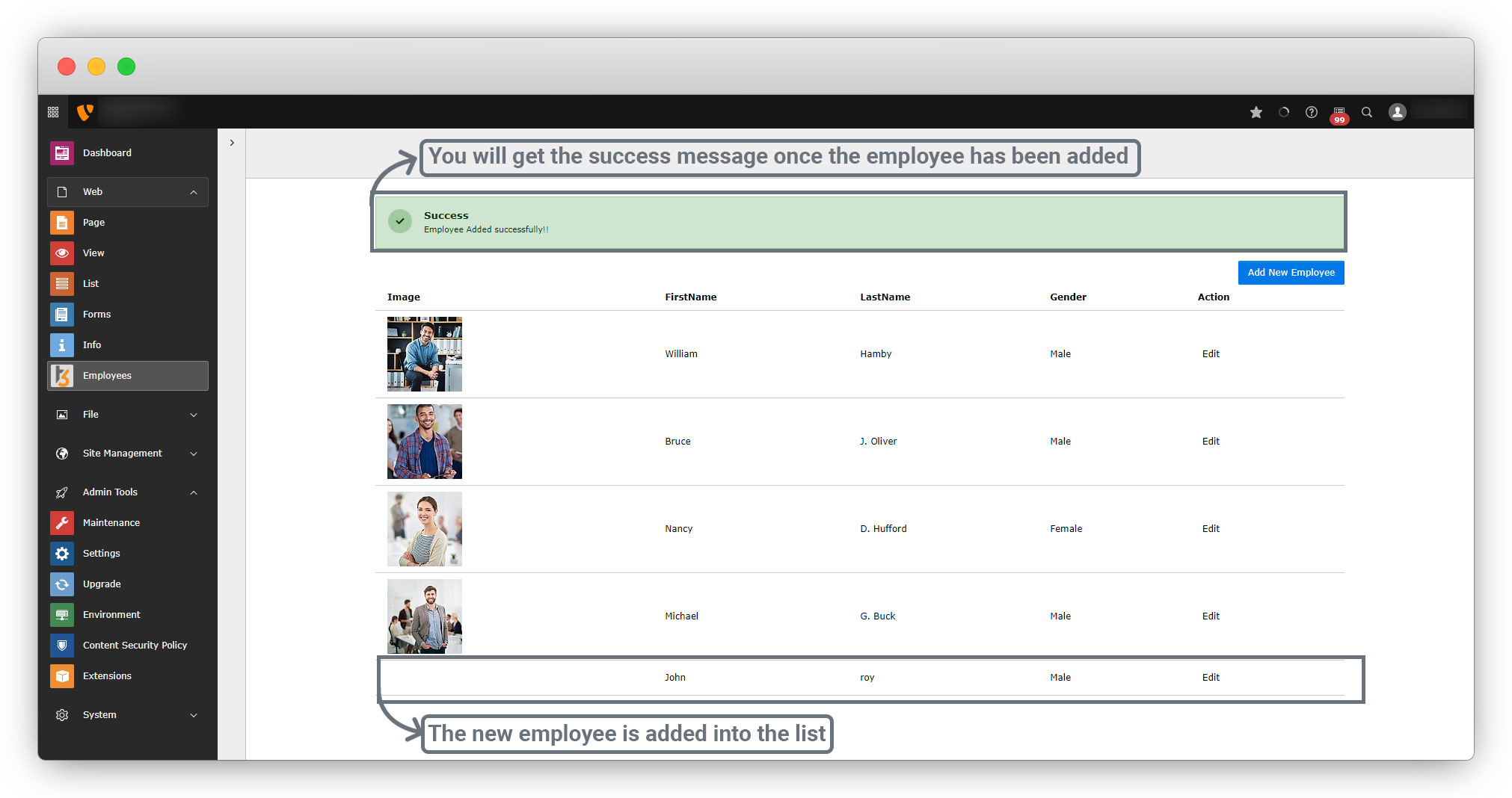 17. After adding the action to the Modules.php file, now fill-up the form and click on “Create New Employee” button and you will see the below screen:
