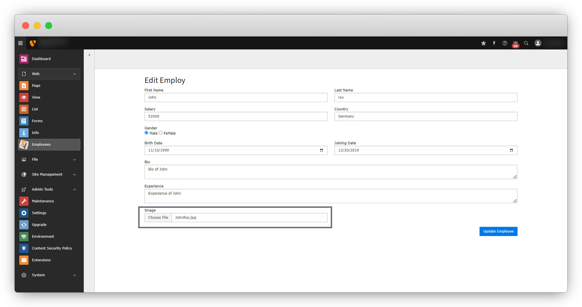 2. Replace the code for image field with the below code in Employ model. The file path is: employeeClassesDomainModelEmploy.php