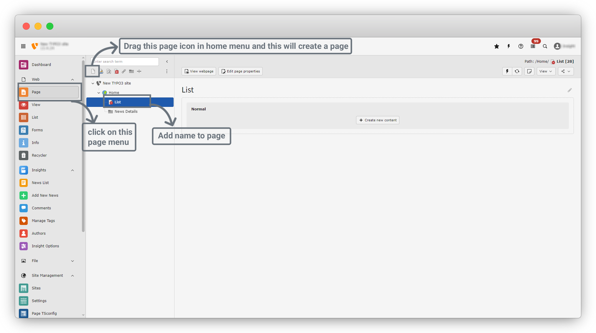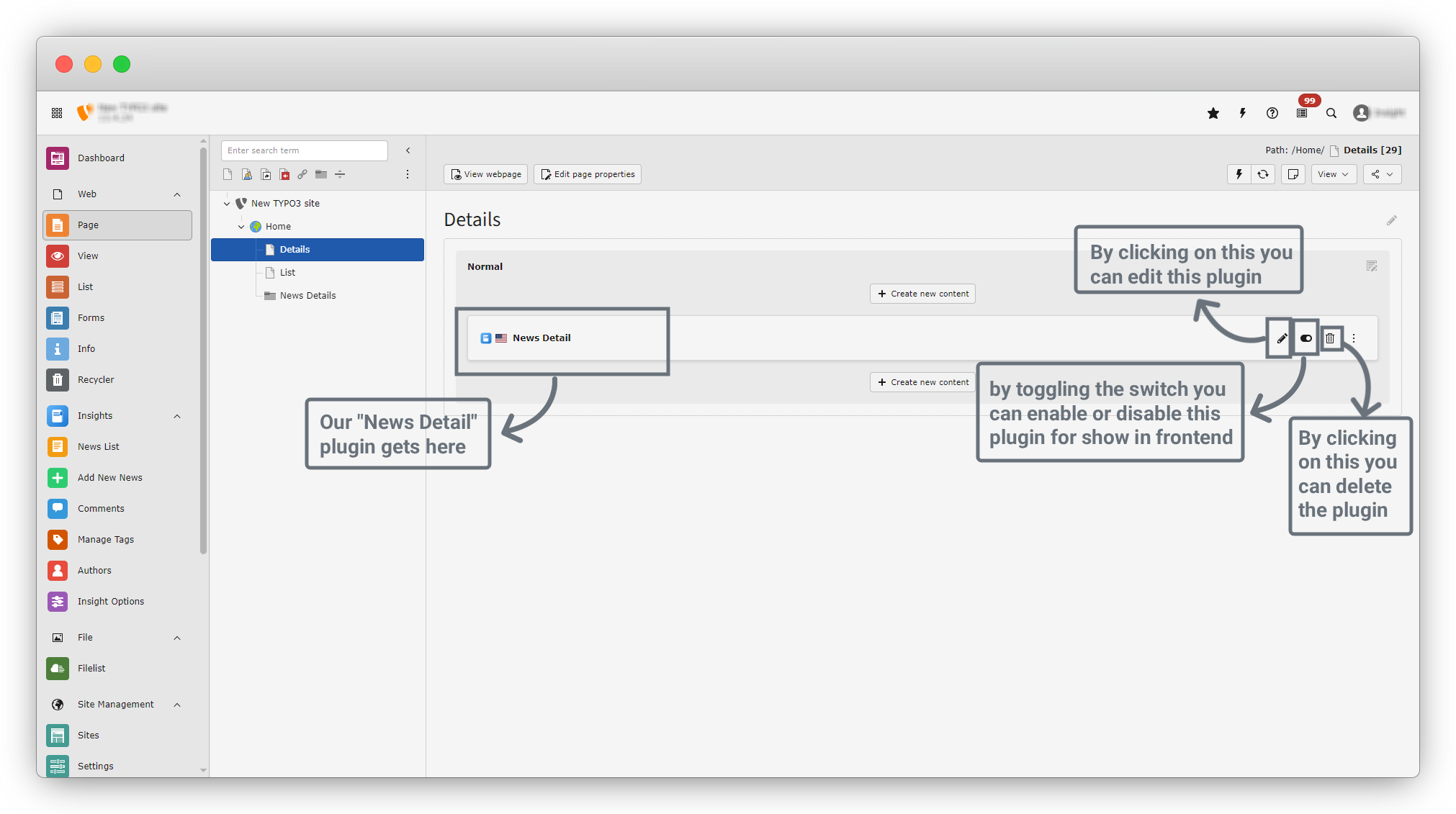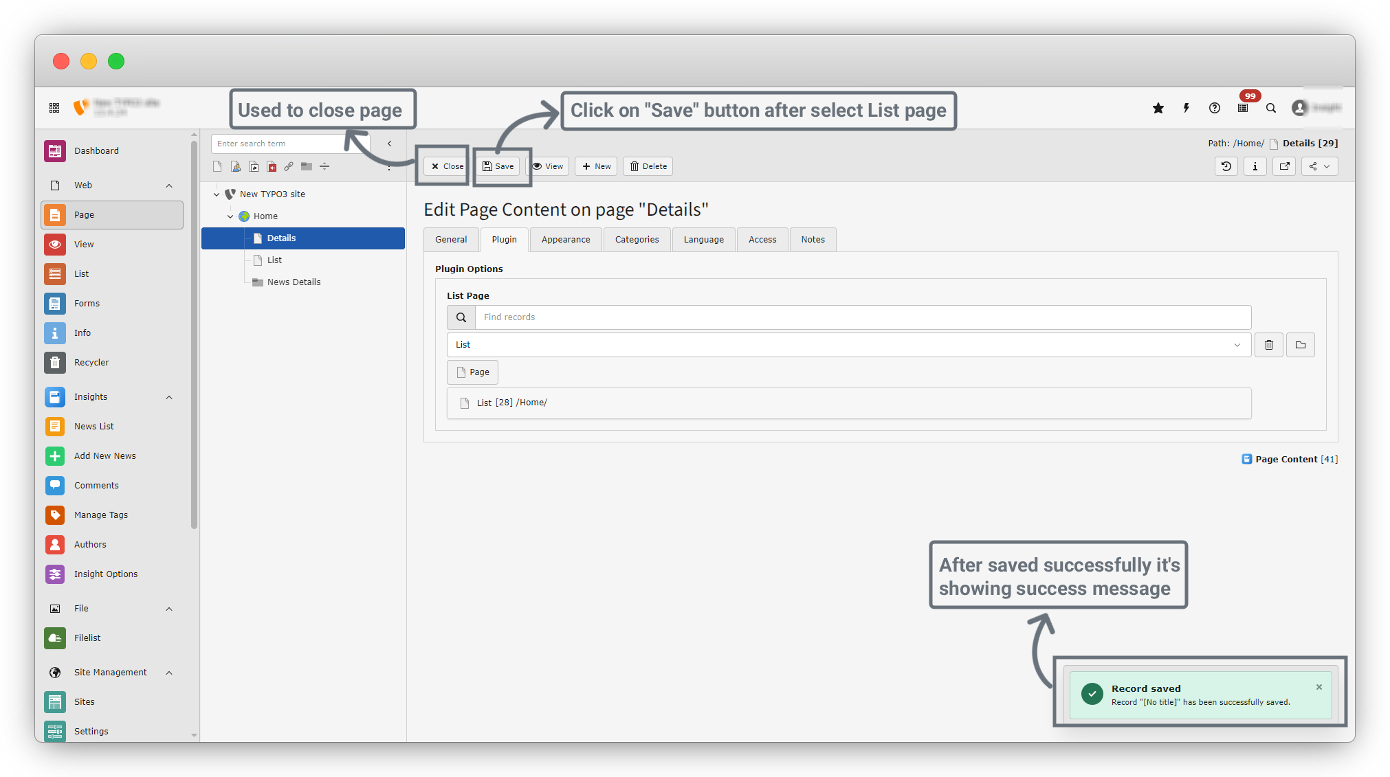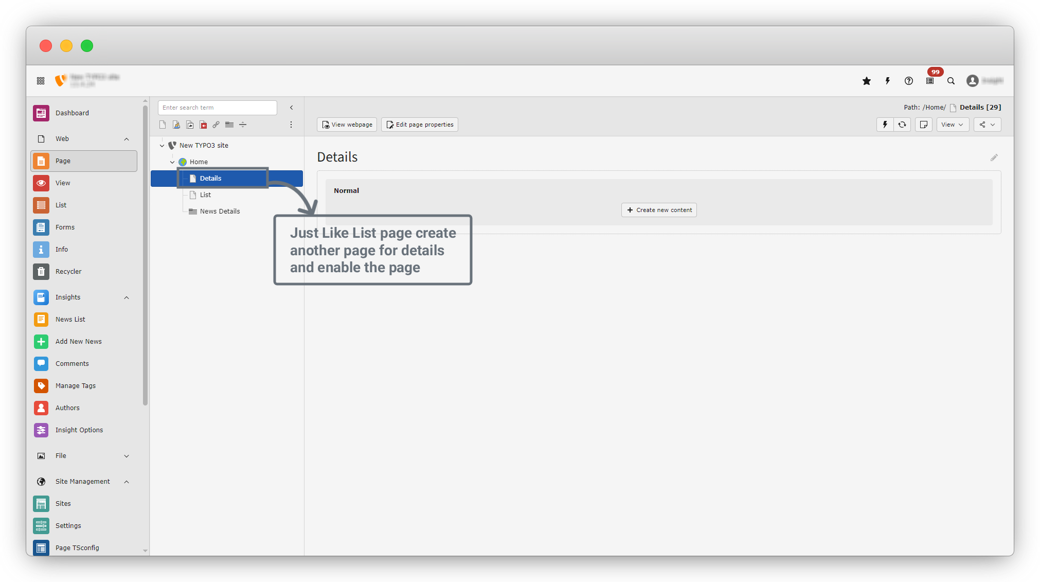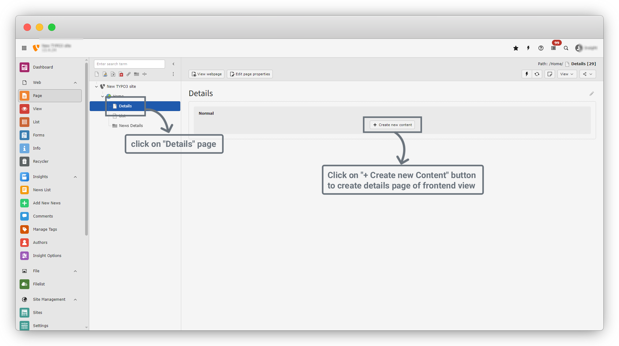 6. after clicking on news Details, you will see the screen of page content. There are many tabs in this page