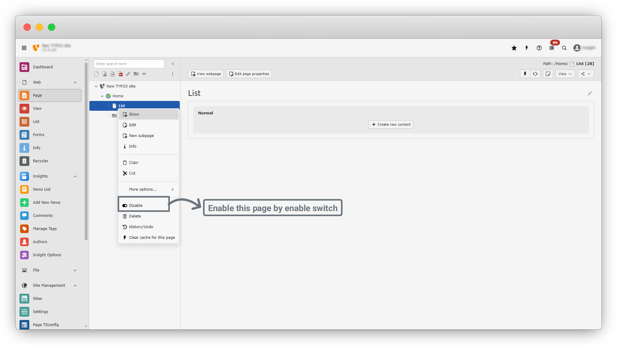 4. Now, right-click on the page and select Enable. If the page is disabled, it will not be displayed on the frontend.