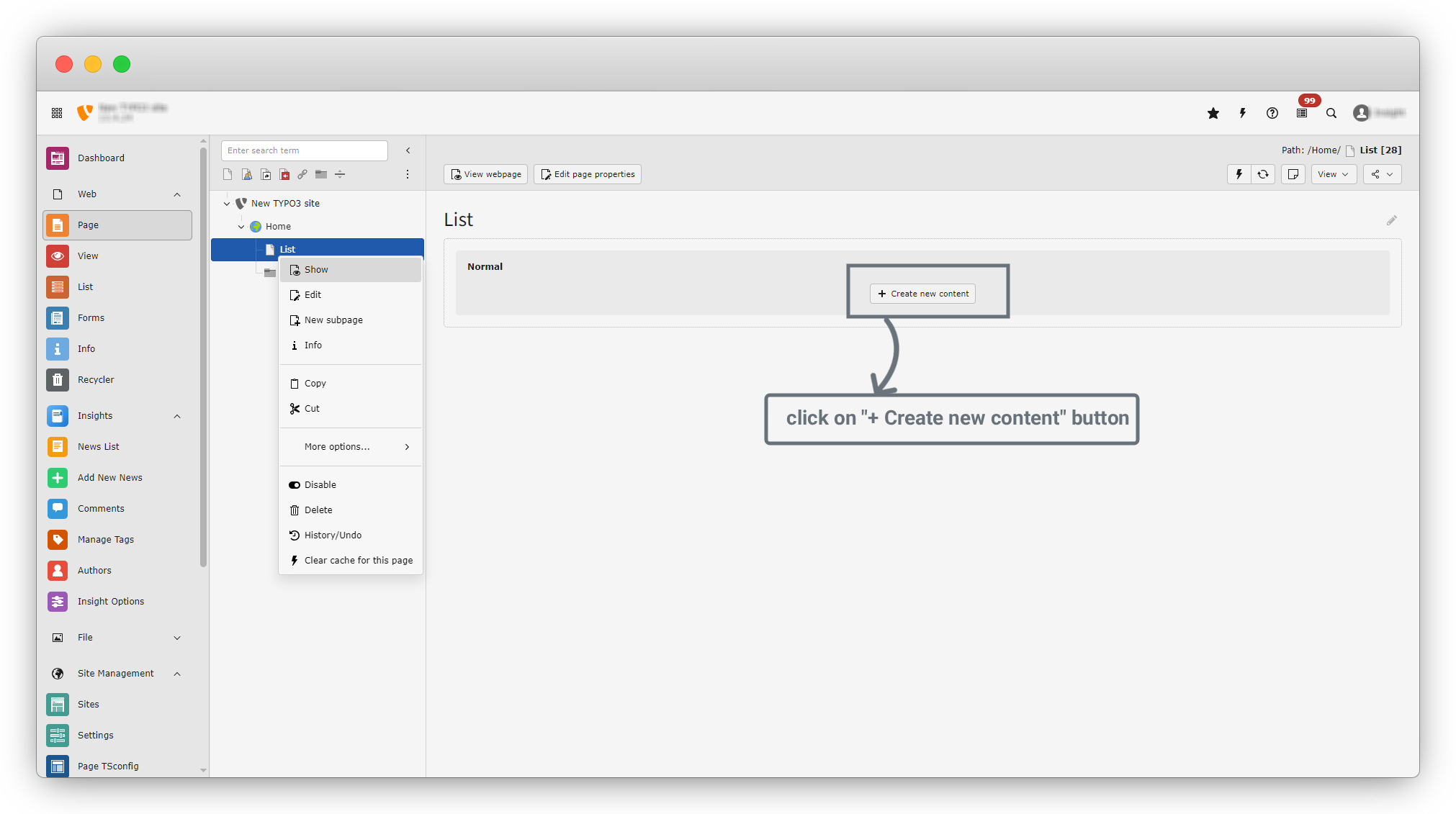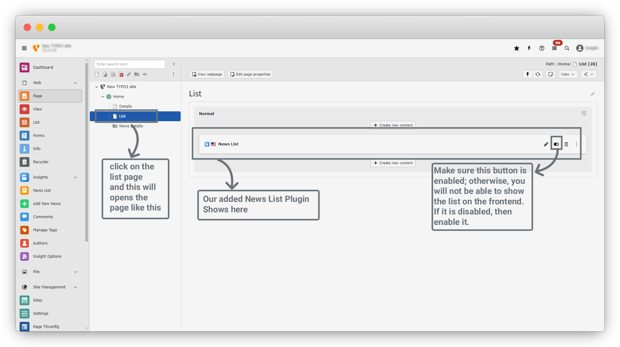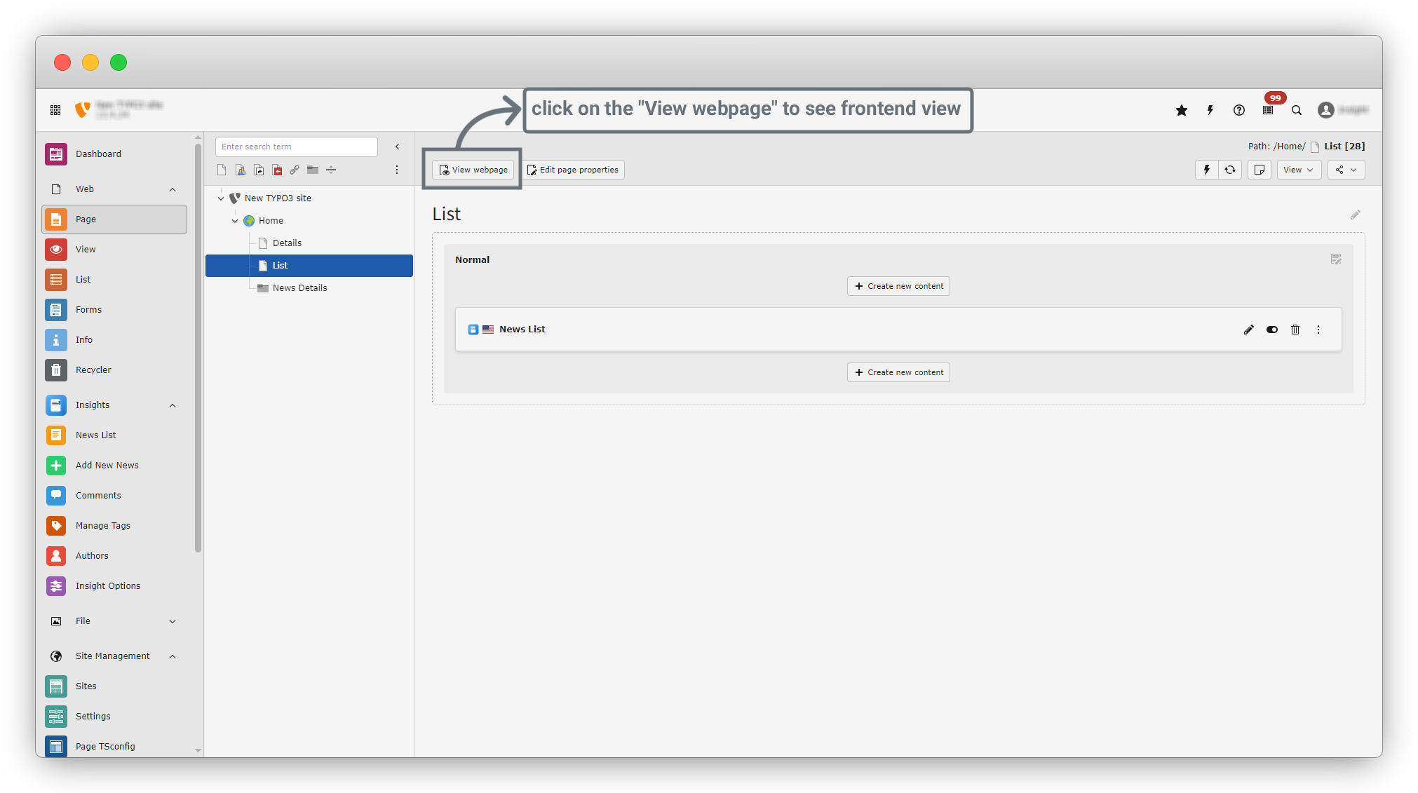 10. After clicking on News List, you will see the Page Content screen. This page has several tabs: