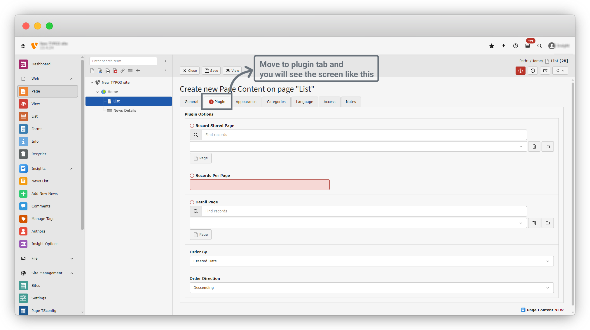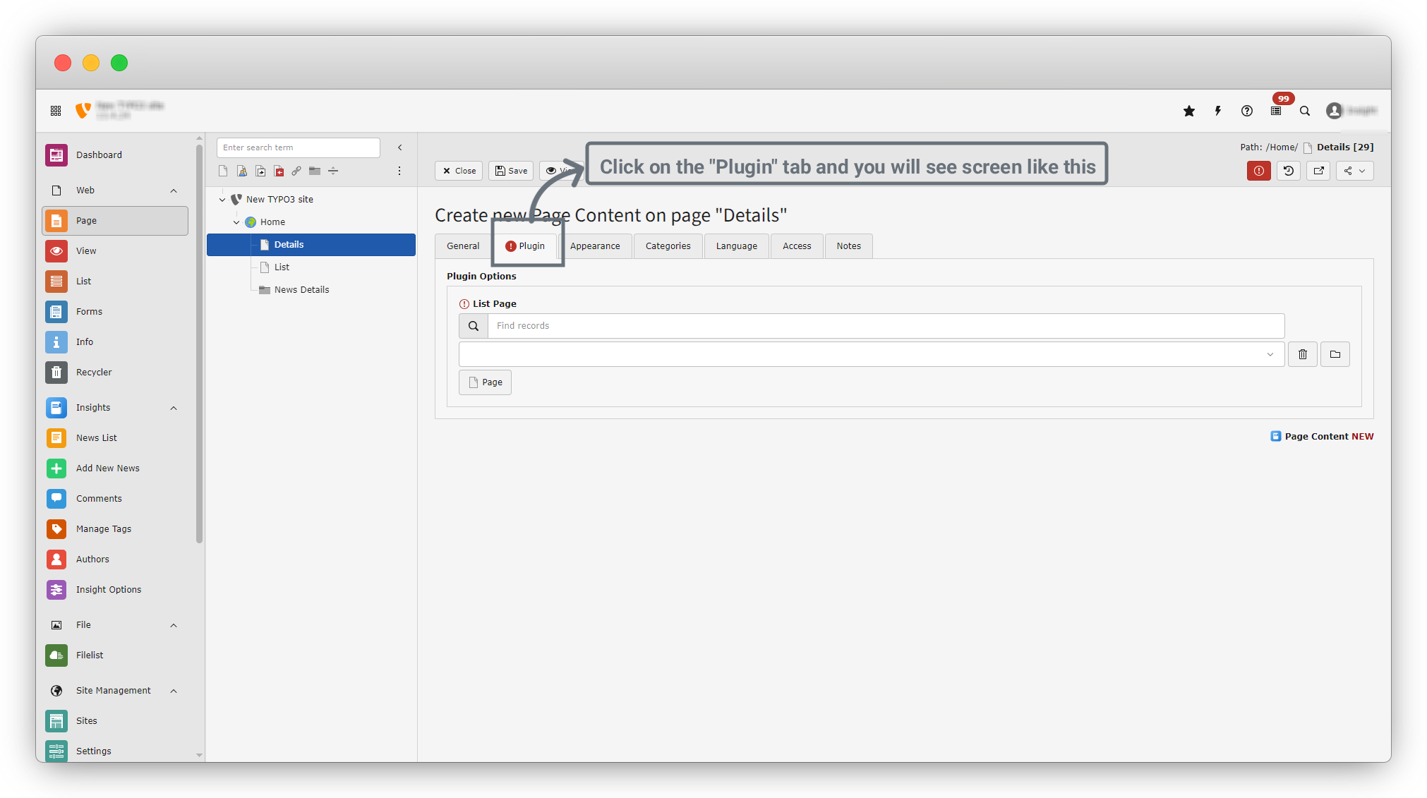11. Click on the Plugin tab, as most of the configuration for the news list will be done here.