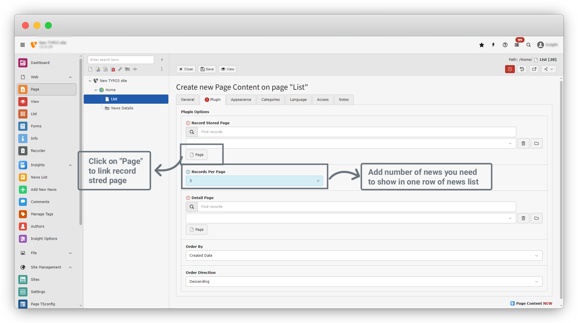 13. Set Records per Page to 3 so that three news items will appear in one row.