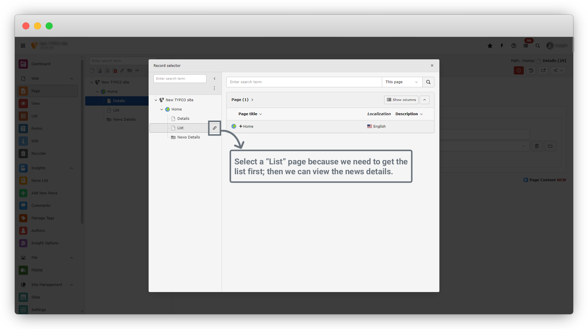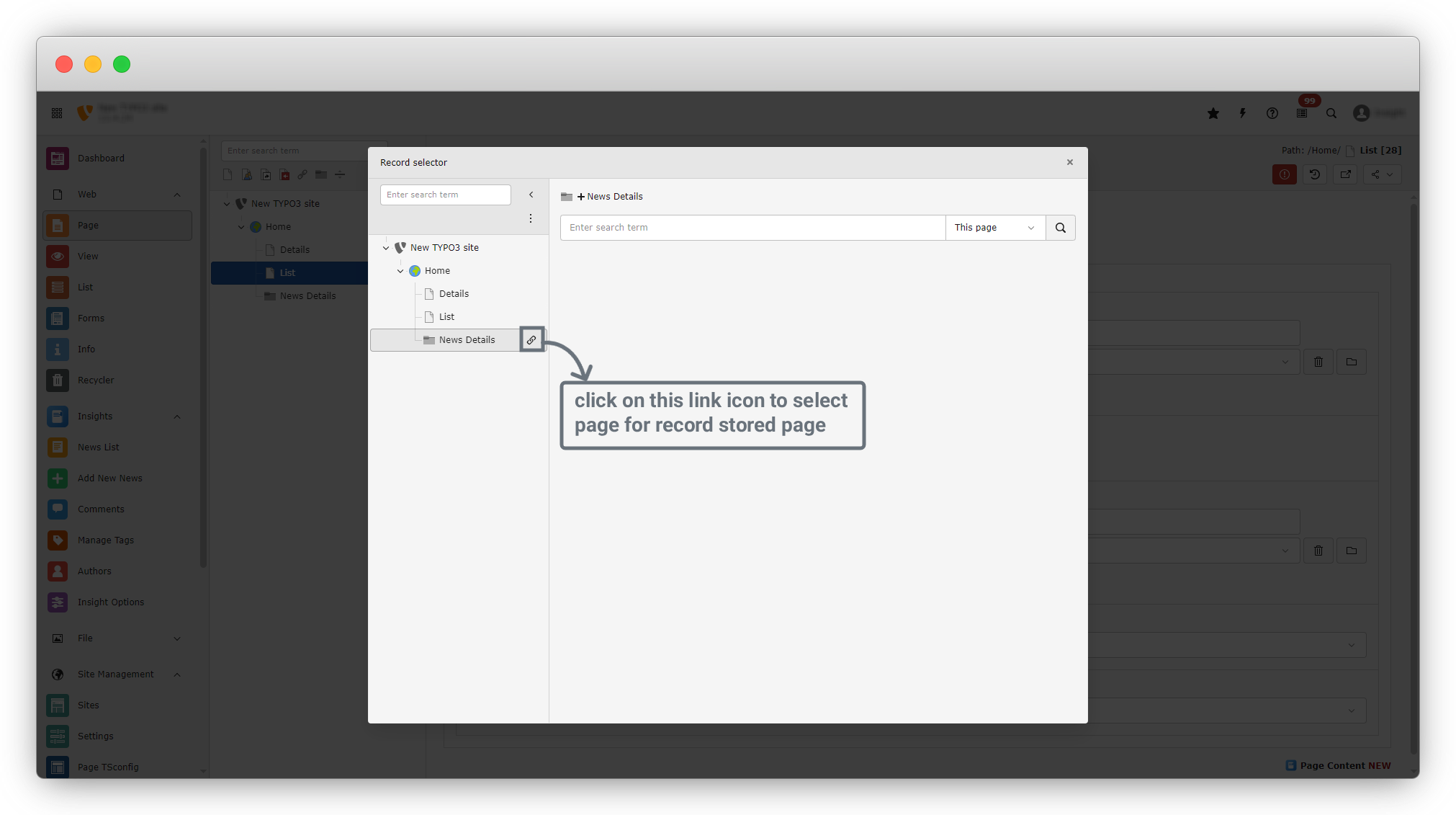 15. After clicking the Page button, a dialog will appear, as shown in the screenshot. Since our news records are stored in the “News Details” folder, hover over the News Details folder. You will see a link icon on the right side. Click on the link icon, and the folder will be selected. See the screenshot below.