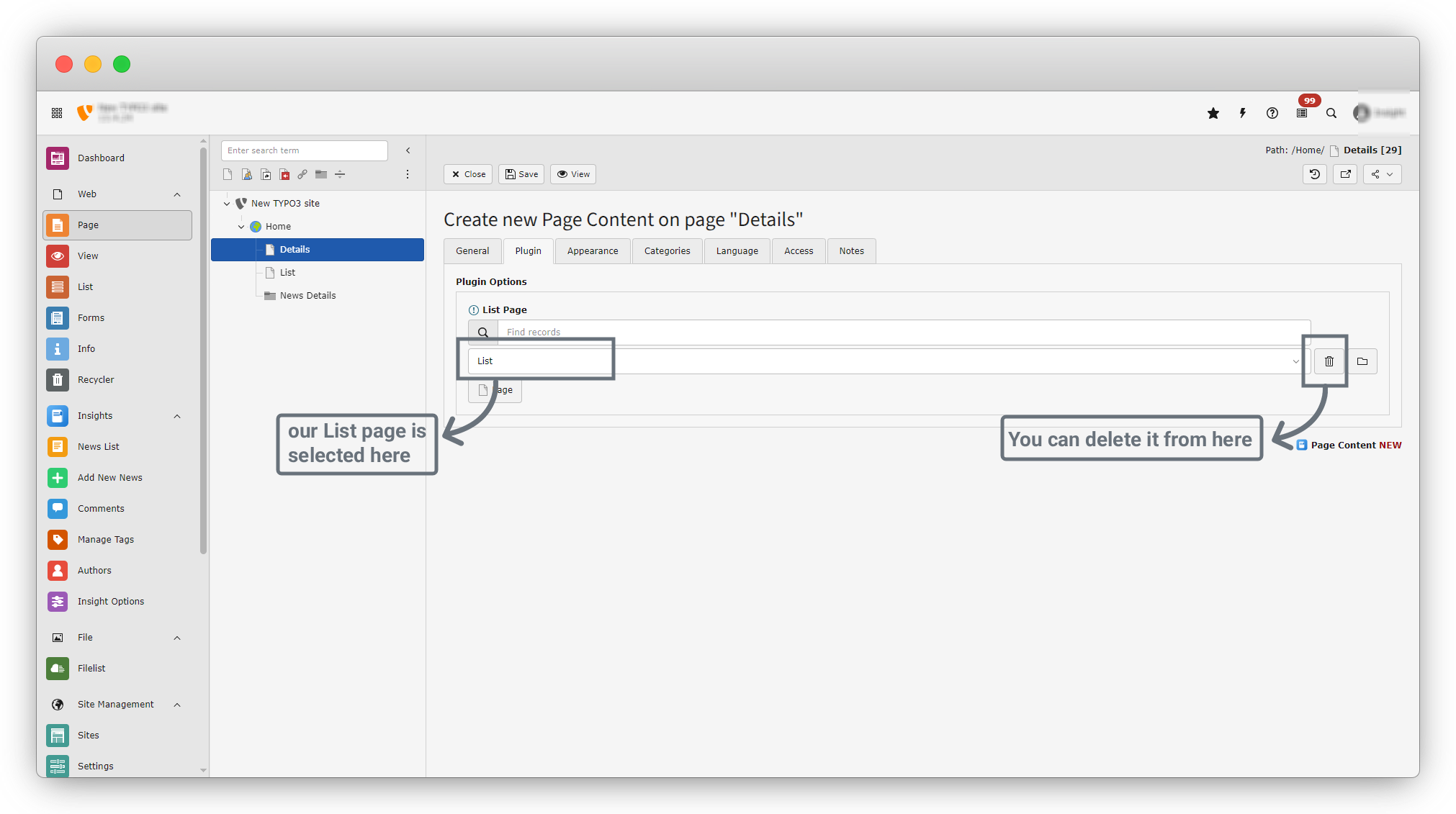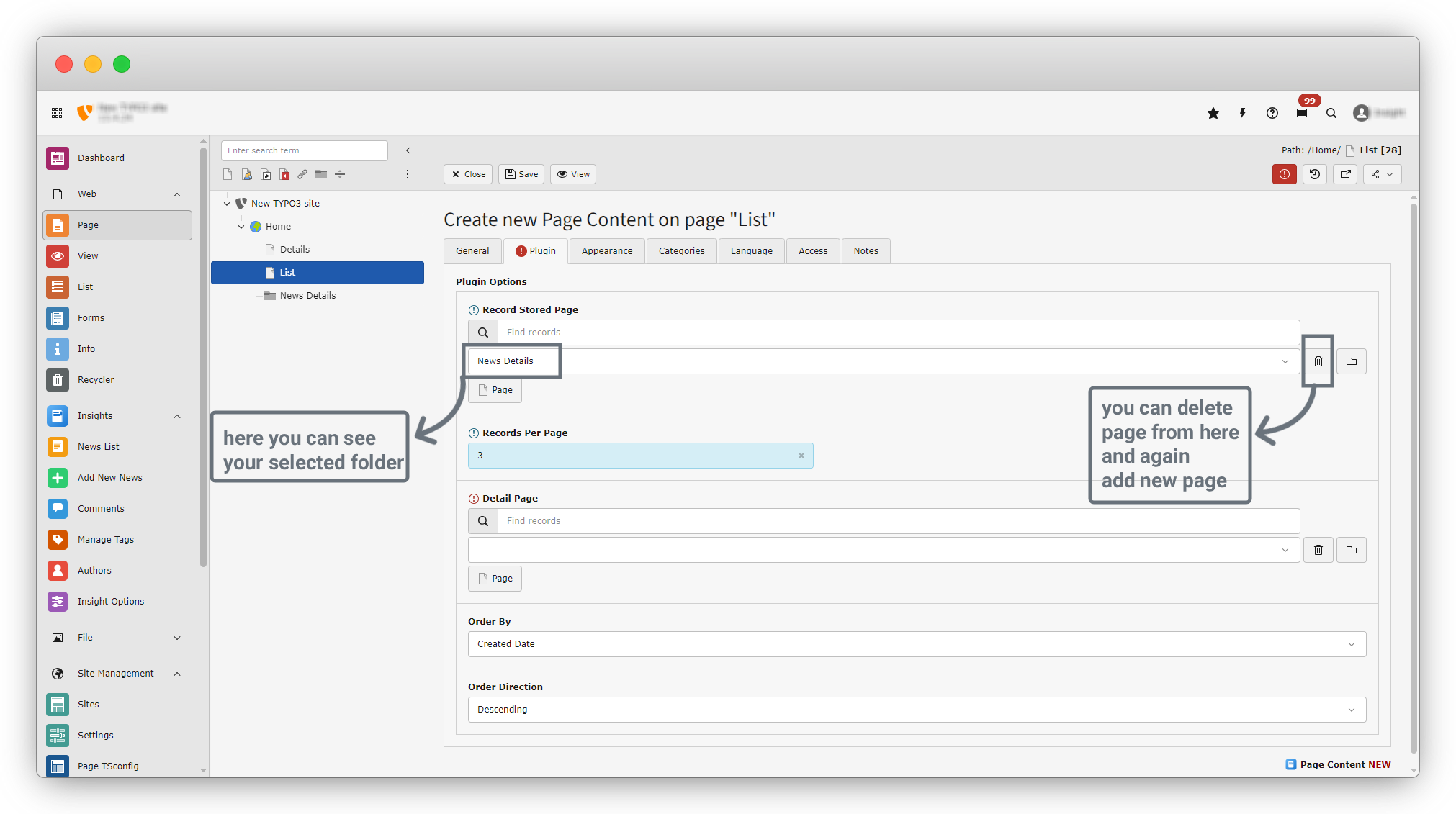 16. Our News Details folder is now selected as the Record Stored Page. If you want to change the record, click the Delete button to remove the current selection, then click the Page button again to select a new record.