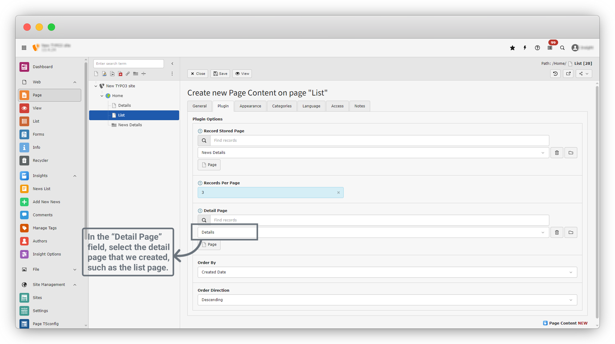 17. Just like we selected the News Details folder for the Record Stored Page, we now need to select the Detail Page. Click on the Page button in the Detail Page field and choose the Details page that we recently created.