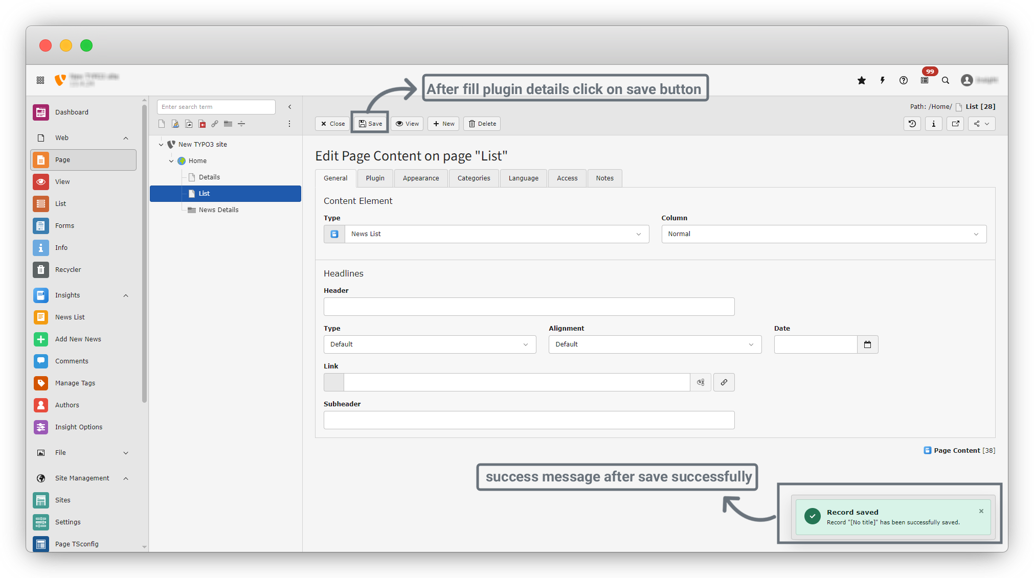11. After filling the List page you have to click on the “save” button to save data. Click on save button and you get a success message of save data successfully.