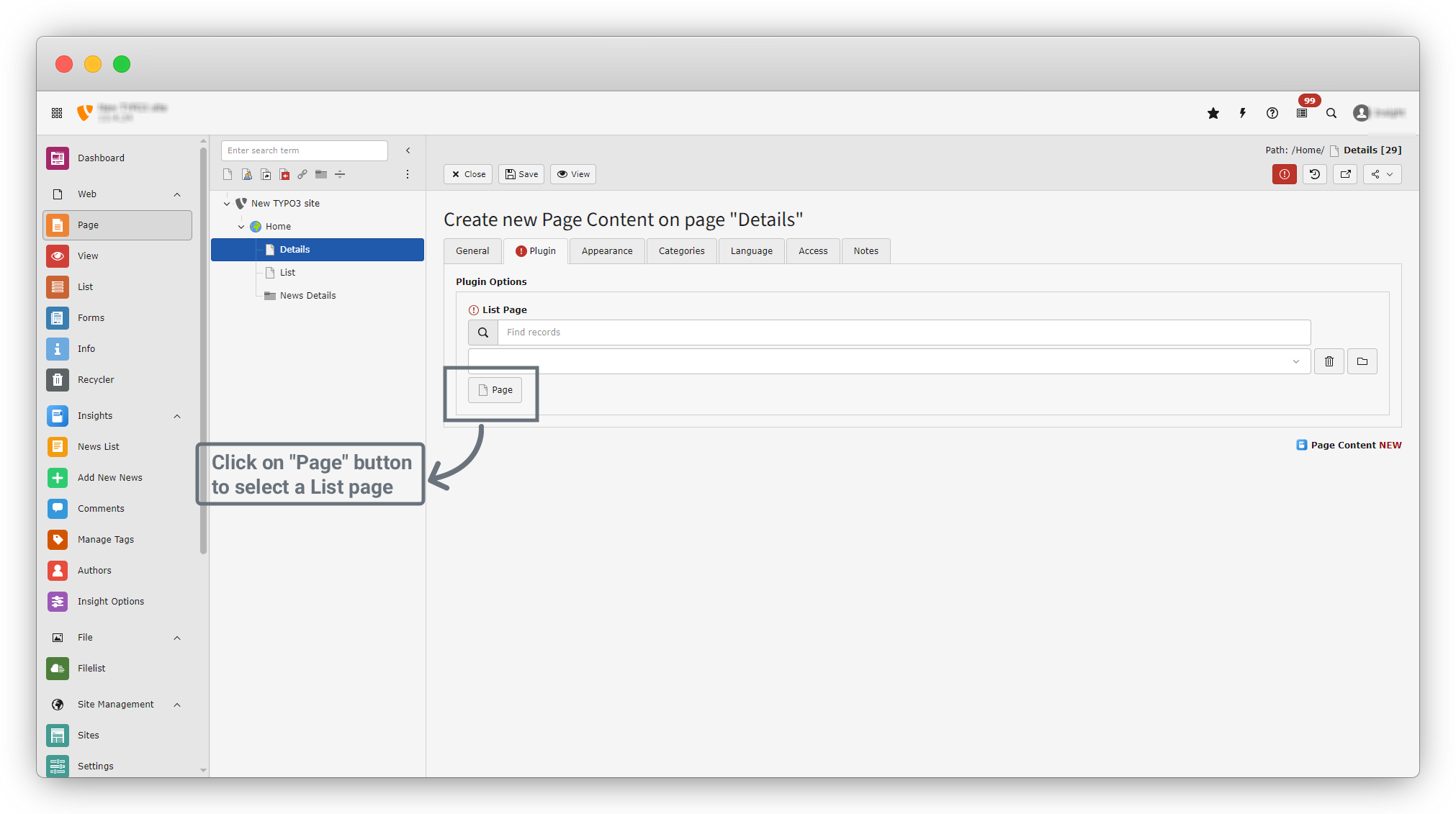 8. You can see one field there called "List page". Here we have to select our Listing page where our news will be listed and our listing page is "List" page. so click on the "Page" button to select a list page.