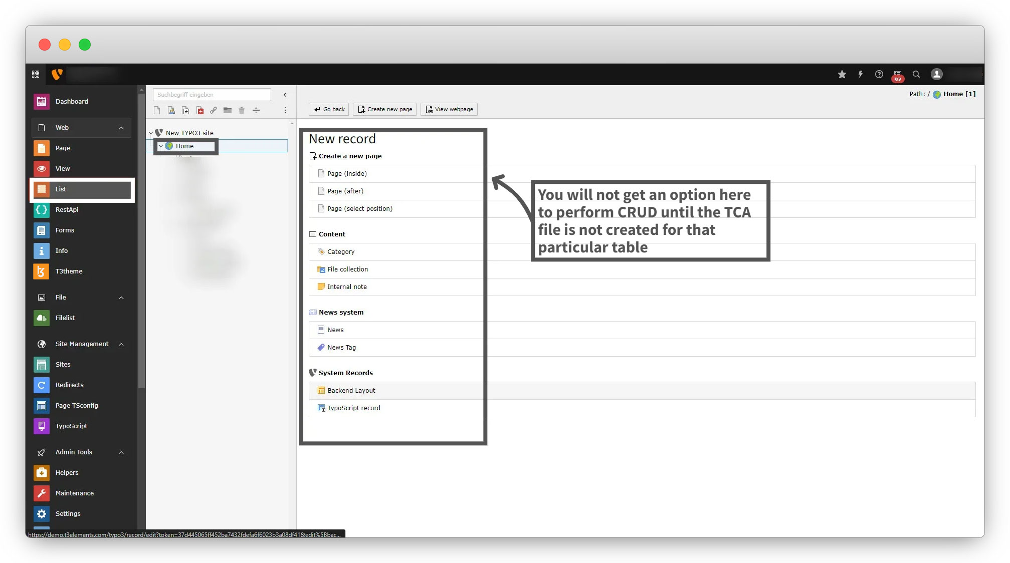 6. Database tables with no corresponding entry in $GLOBALS[‘TCA’] are “invisible” to the TYPO3 backend, so if no TCA file is created for individual table, then you will not find any option in backend to add new record for that particular table.