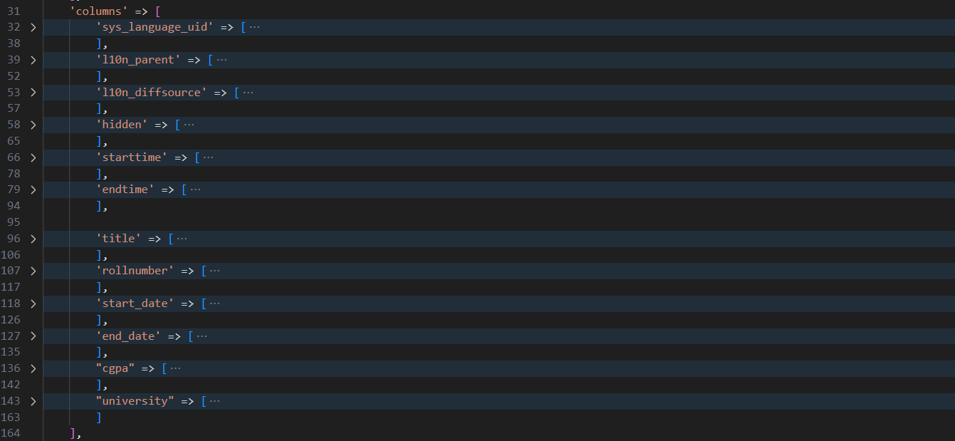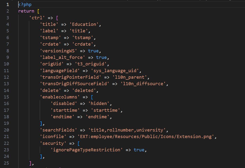 Education TCA file for “ctrl” (file path: employee/Configuration/TCA/tx_employee_domain_model_education.php)