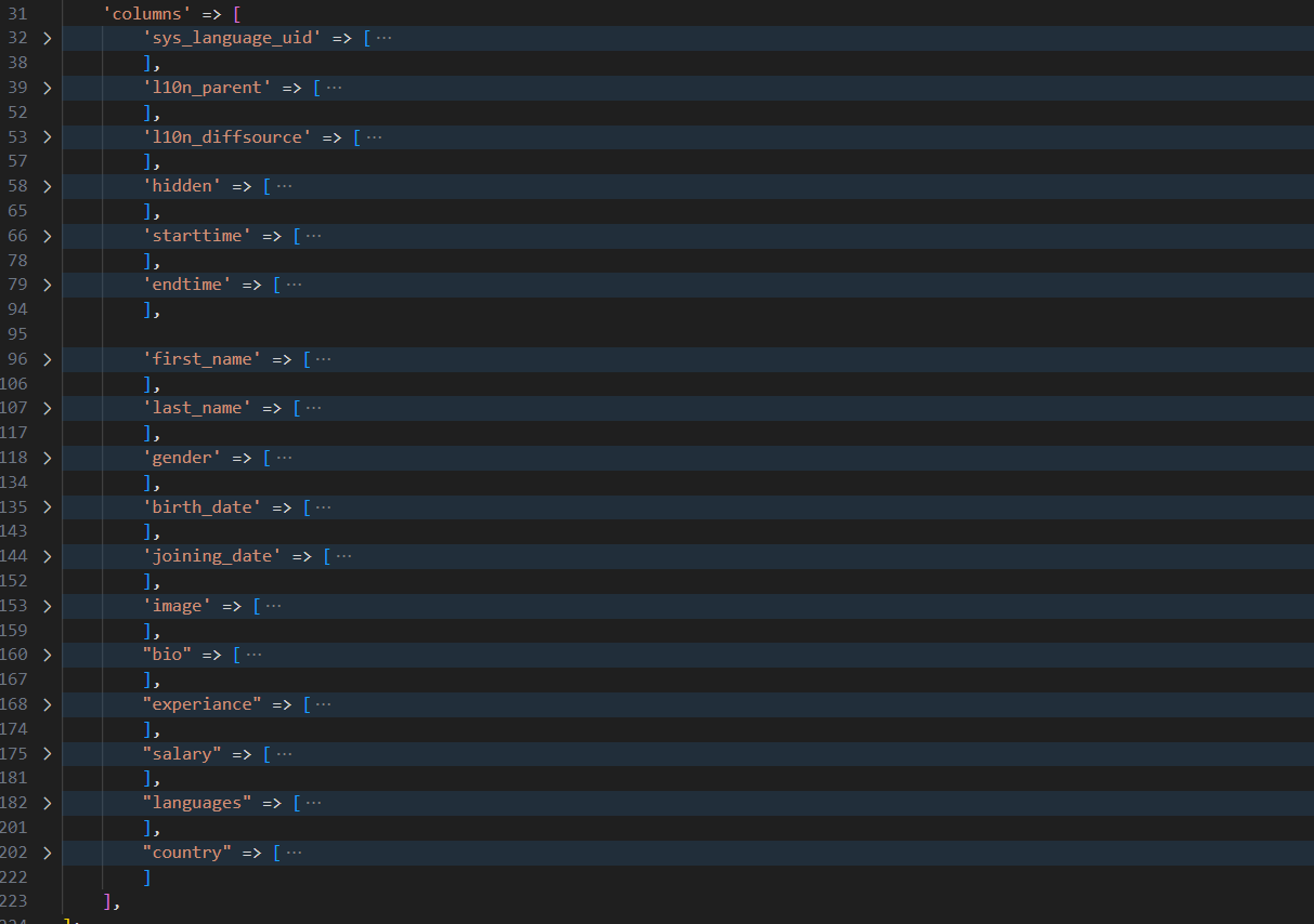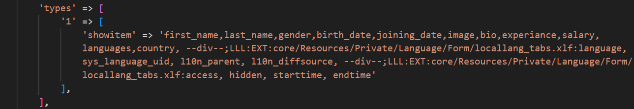 'showitem' => 'first_name,last_name,gender,birth_date,joining_date,image,bio,experiance,salary,languages,country, --div--;LLL:EXT:core/Resources/Private/Language/Form/locallang_tabs.xlf:language, sys_language_uid, l10n_parent, l10n_diffsource, --div--;LLL:EXT:core/Resources/Private/Language/Form/locallang_tabs.xlf:access, hidden, starttime, endtime'