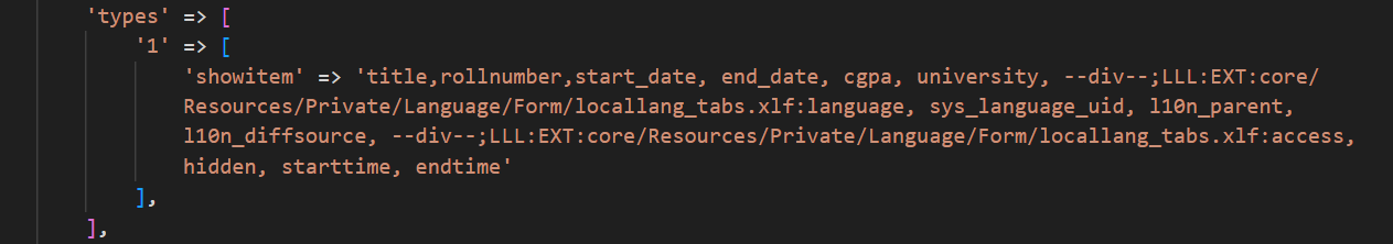 'showitem' => 'title,rollnumber,start_date, end_date, cgpa,employ, university, --div--;LLL:EXT:core/Resources/Private/Language/Form/locallang_tabs.xlf:language, sys_language_uid, l10n_parent, l10n_diffsource, --div--;LLL:EXT:core/Resources/Private/Language/Form/locallang_tabs.xlf:access, hidden, starttime, endtime'