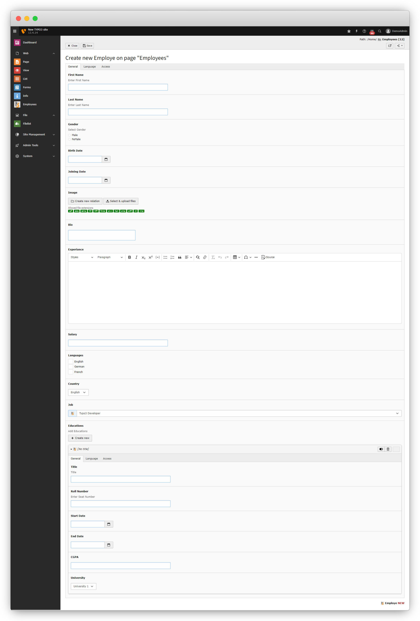 Here you can see that there is no option to add the education for the employee. So we need to establish the relation between the tables.