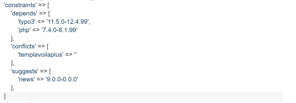 9. constraints – List of requirements, suggestions, or conflicts with other extensions or TYPO3 or PHP versions.