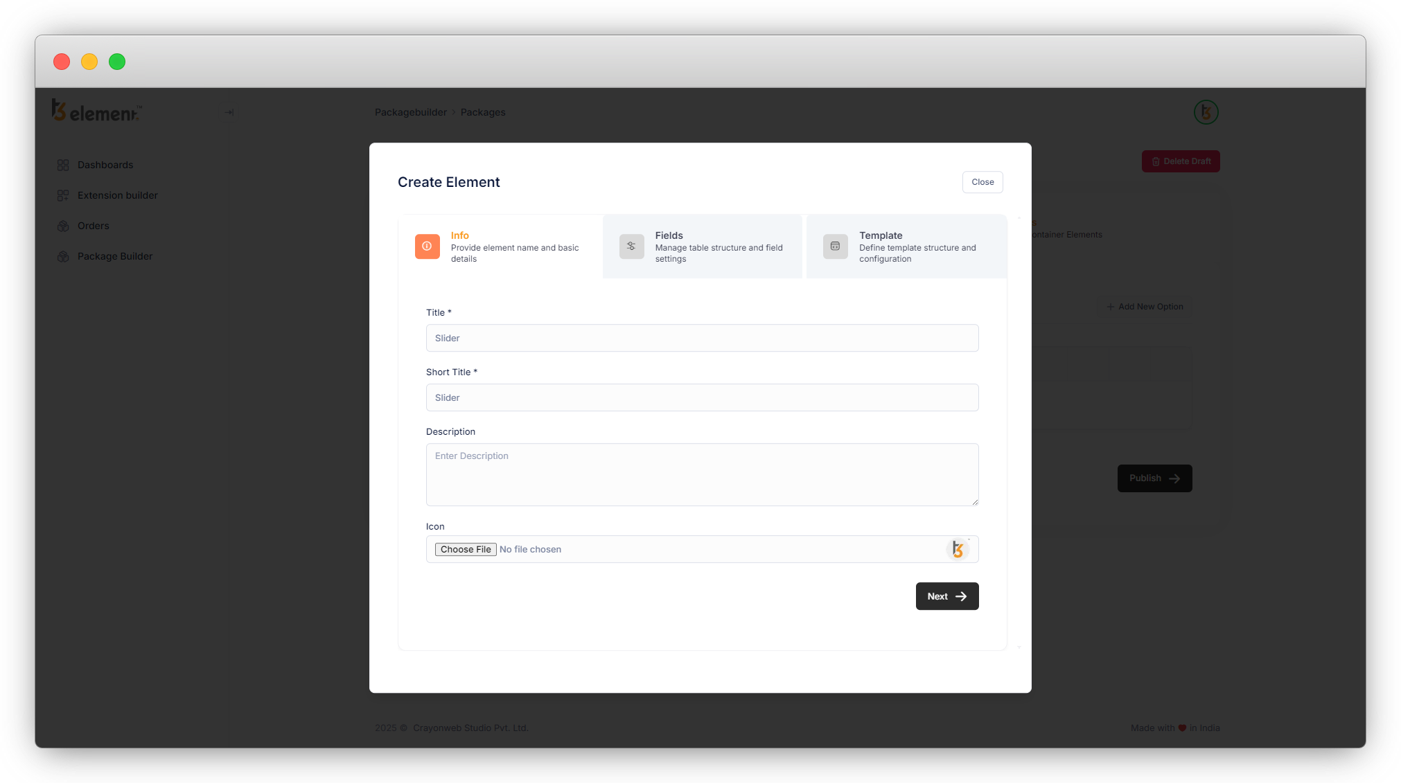 Here is an example. Let’s create an element to be more clear about how to create custom elements by using T3Element Builder. Let’s create a Slider element.