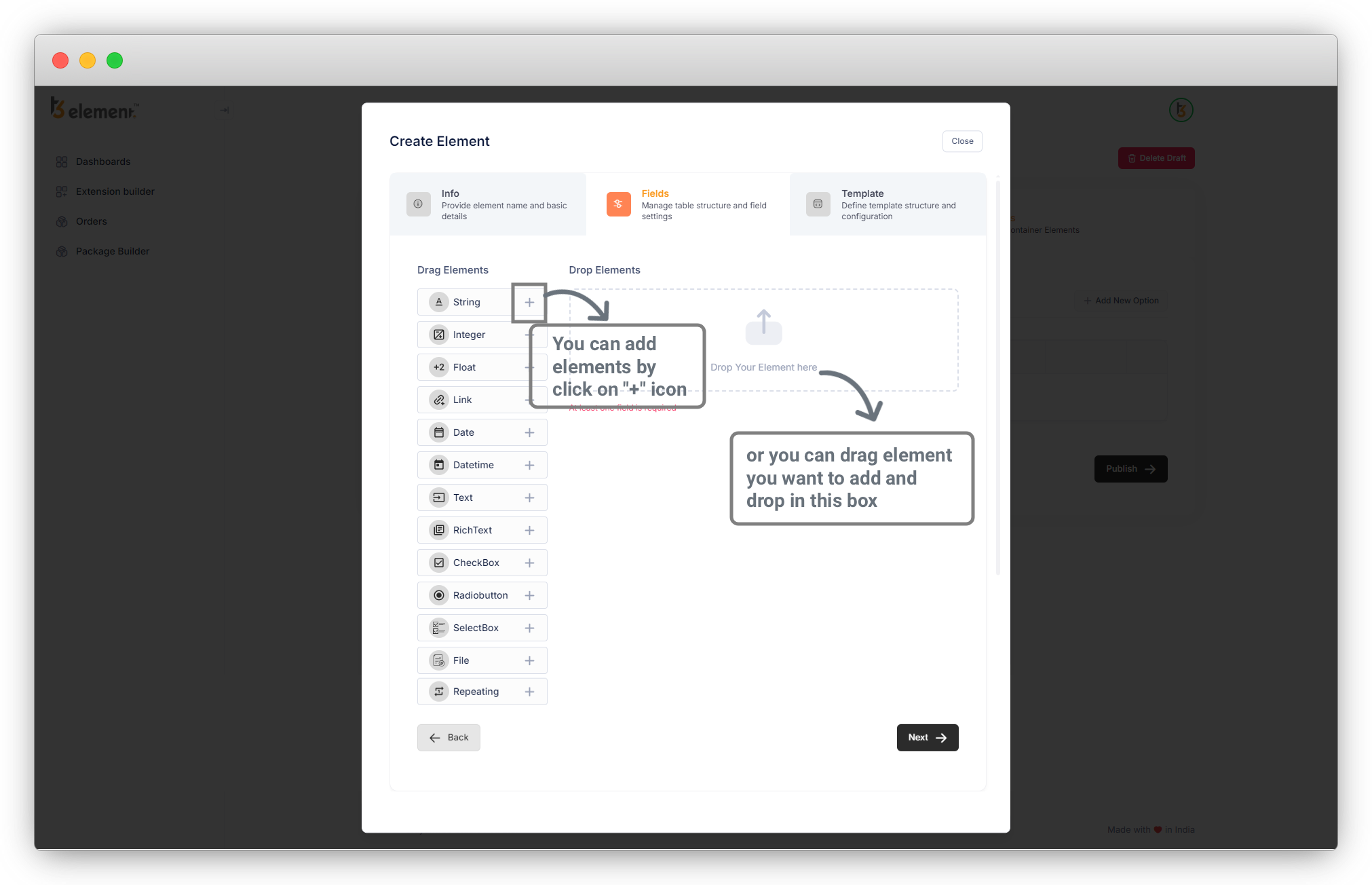 You can add elements from the available list of elements on the left side. Add an element or field by clicking on the “+” icon or drag the element and drop it into the box, that way you will add the desired fields and will create the elements, e.g. Slider, Teaser Box, CTA, etc.
