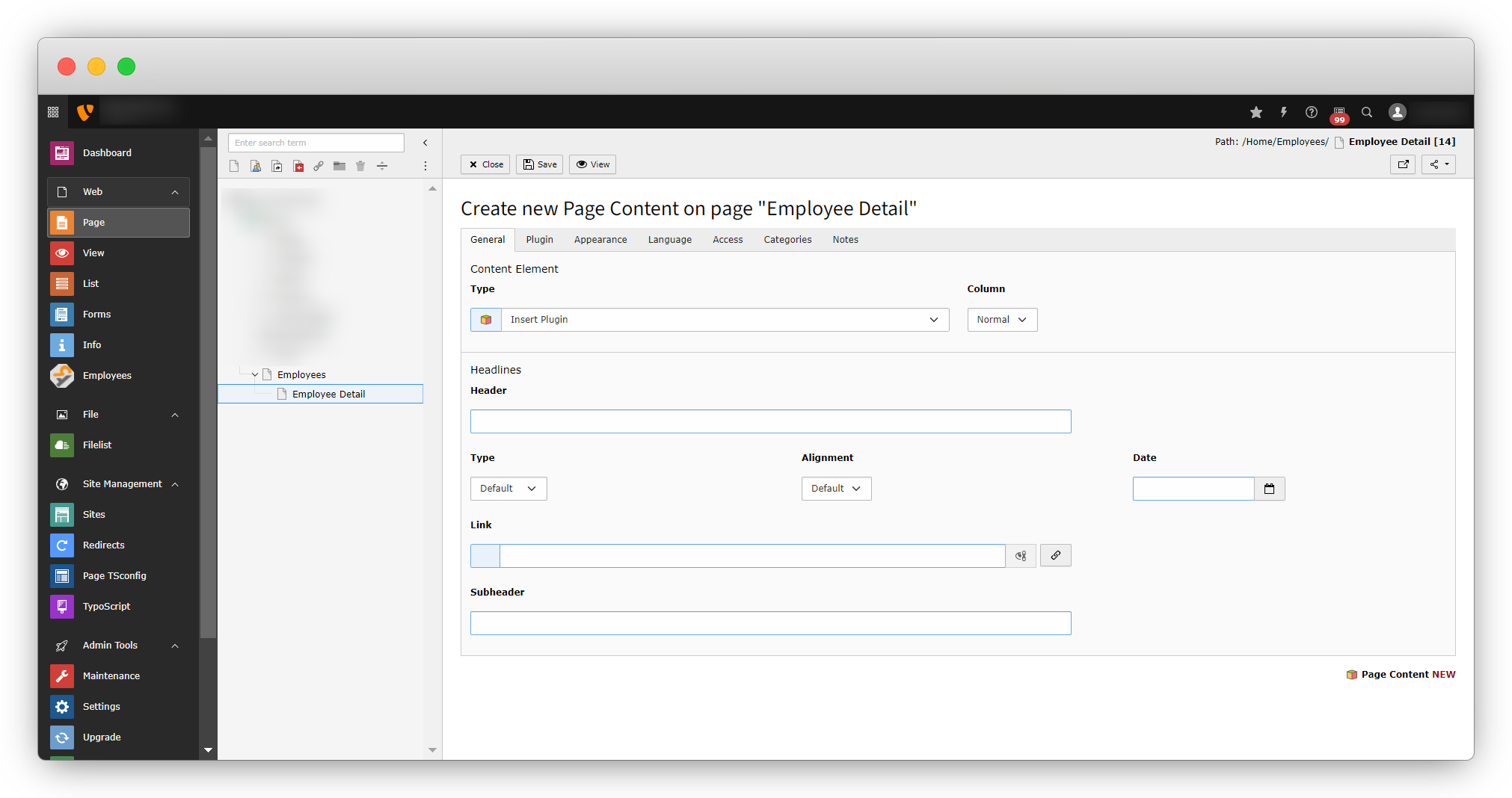 Create a new page for the “Employee detail” under the “Employee” page, click on the “+Content” button and you will see the wizard, go to Plugins > select the Employees Detail plugin and you will be redirected to the screen as seen in the screenshot below.