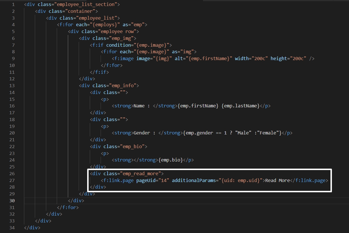 2. Add the below code in the template file after the “bio” section to provide a link for each of the employees to open their corresponding detail page.