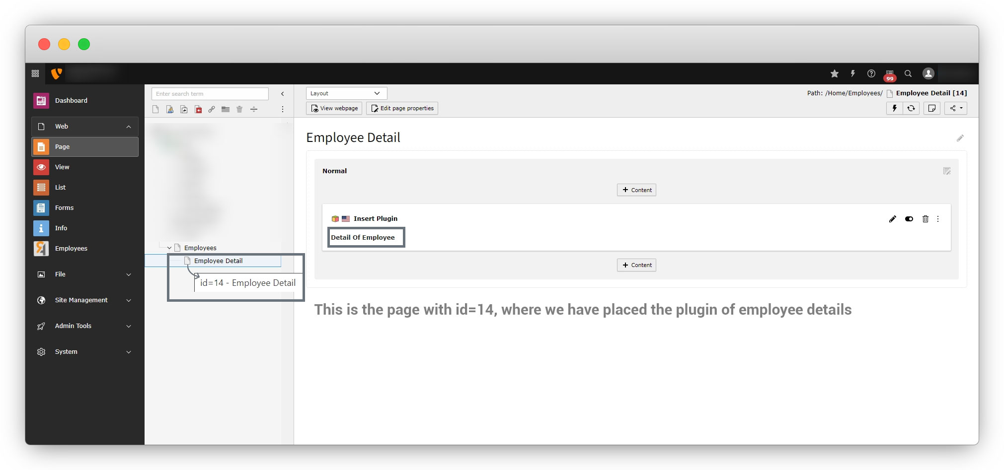 5. As you can see in the above screenshot, the pageUid is 14 which has been put static for now. That is the ID of the page on which the details will be rendered, the page “Employee Detail” as you can see in the below screenshot.