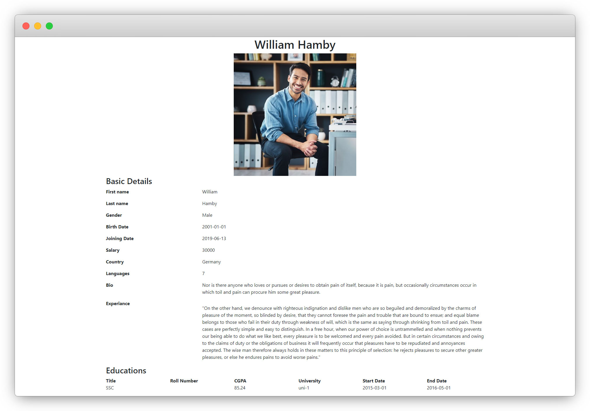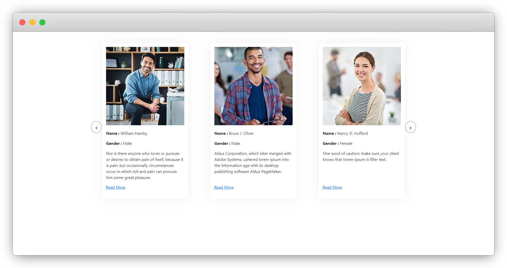 Save the template file, flush the cache, reload the page in the front-end, and click on the Read More button for any of the employees and you will be redirected to the details page of that particular employee as you can see in the below screenshot.