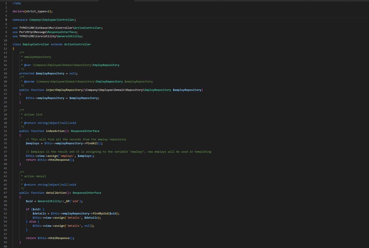 4. You can see the final code of the controller file in the below screenshot after adding the GeneralUtility and the detail action.