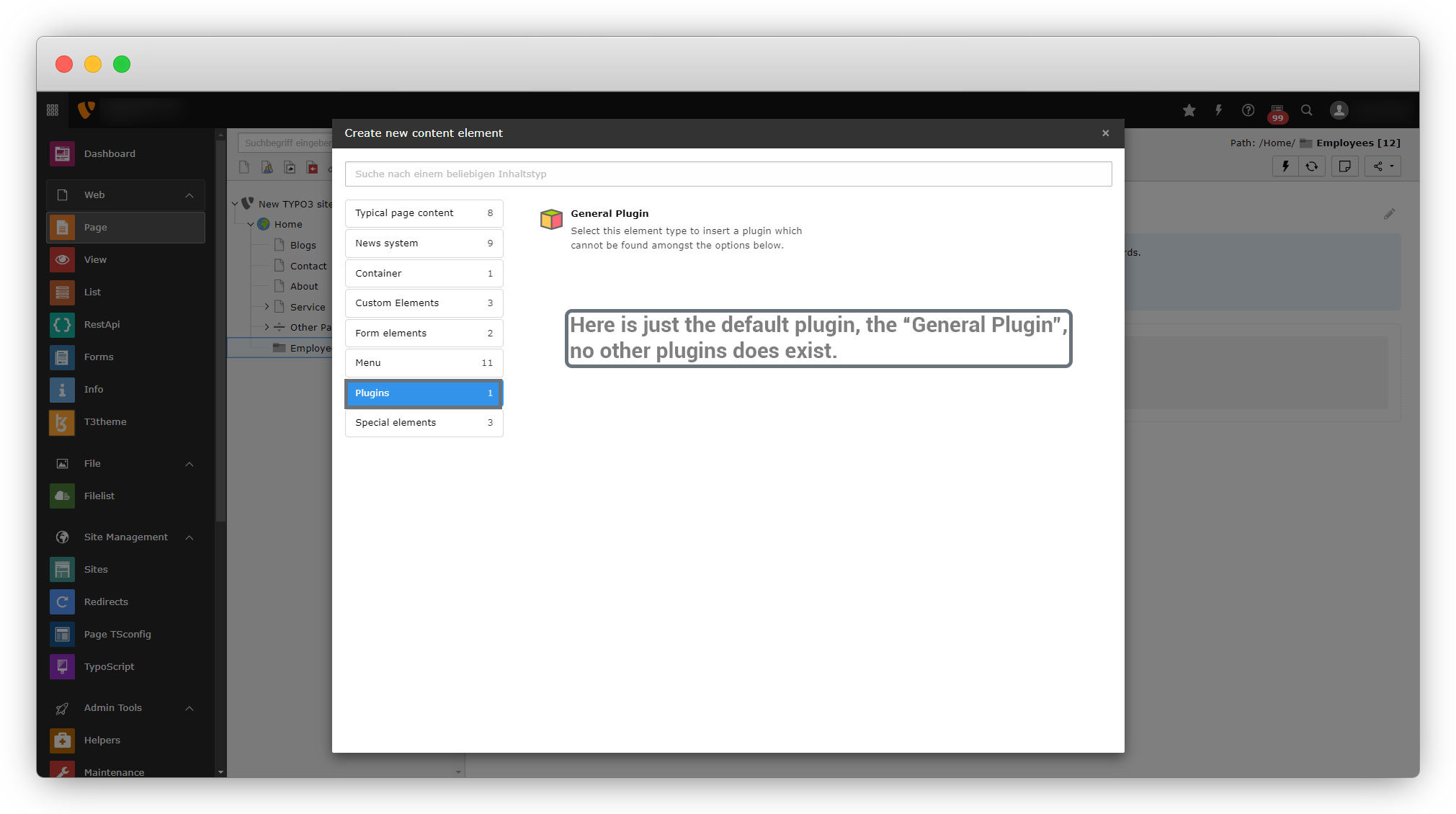 - Content element plugins can be added by editors to pages in the Page module while TypoScript frontend plugins can only be added via TypoScript or Fluid in a predefined position of the page.