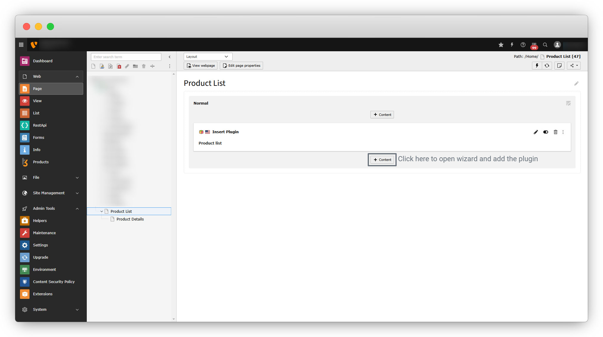3. Open the page “Product Details”, click on the “+ Content” button, and select the plugin “Product detail plugin” from the wizard.