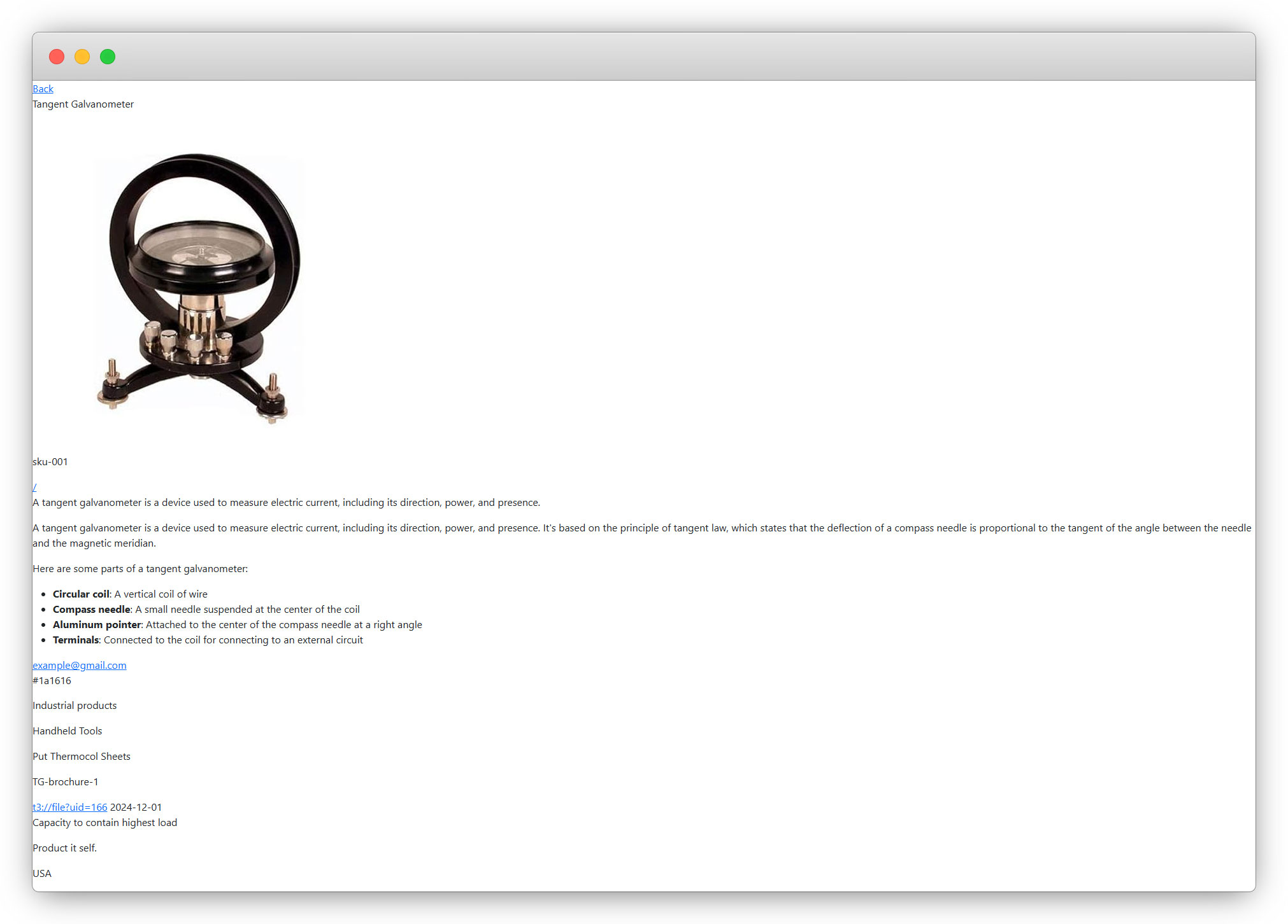 5. After saving the page “Product Details”, click on the “Learn More” button of any product from the product list, and the corresponding detail page will open. Let’s click on the “Tangent Galvanometer” and the detail page will open