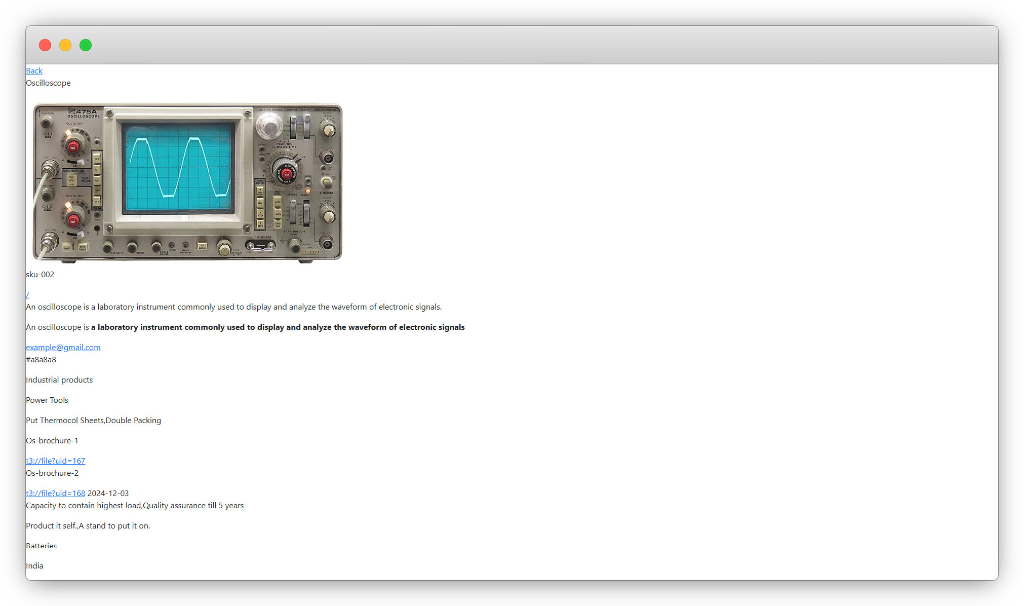 3. Save the page and click on the view button at the top left and the detail page of the product “Oscilloscope” will open because in “Select Items” we selected the product “Oscilloscope”: