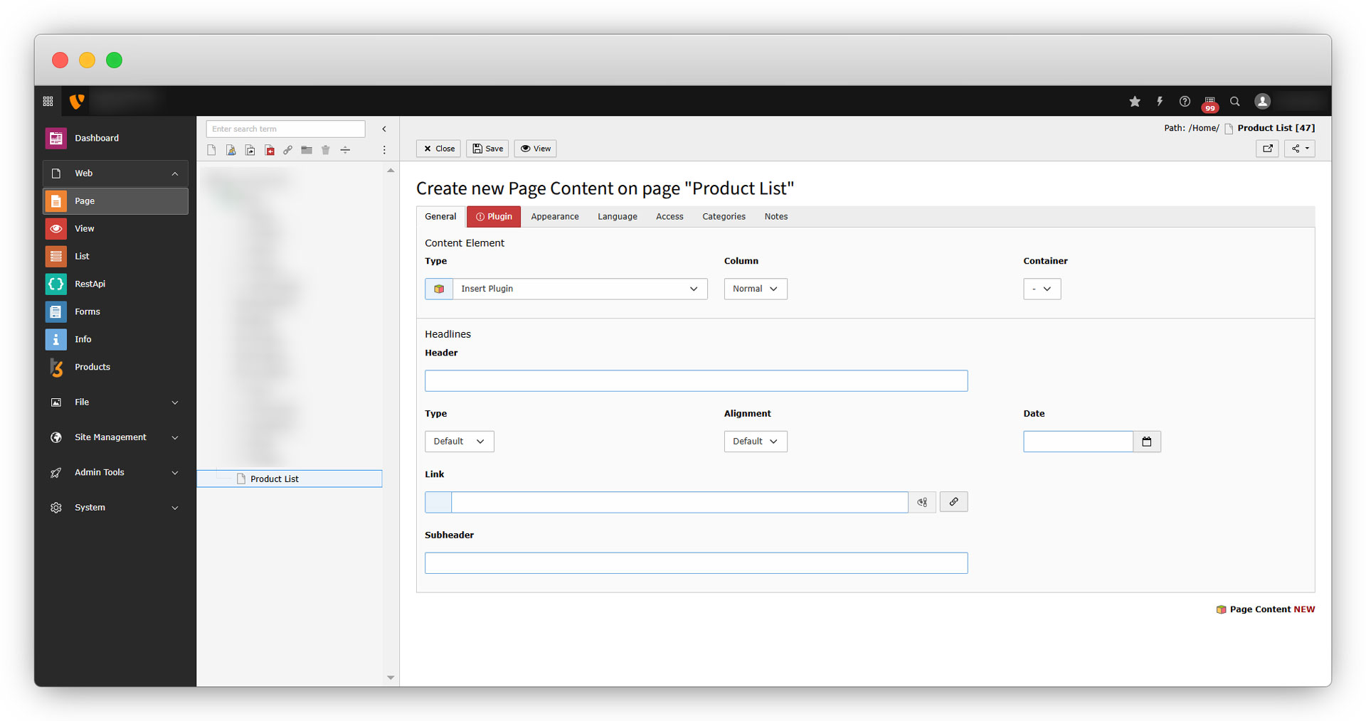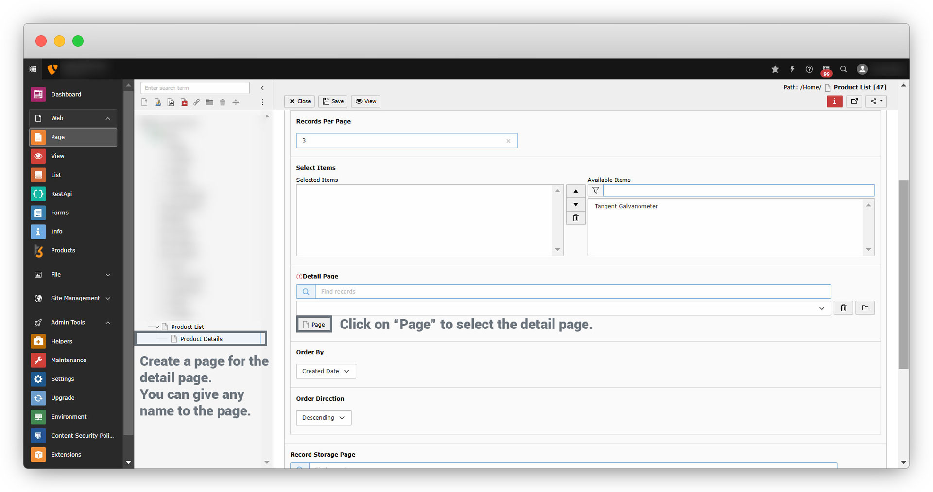 9. Add the “Detail page”. At the time of creating the list plugin, we checked the checkbox of “Detail Page?”, so that we can have a detail page for products. Here we have to choose the detail page for products. For that, we need to create a detail page and select that detail page by clicking on the “Page” button.