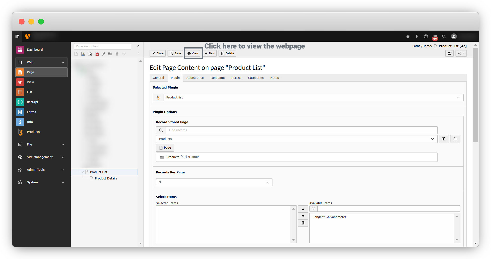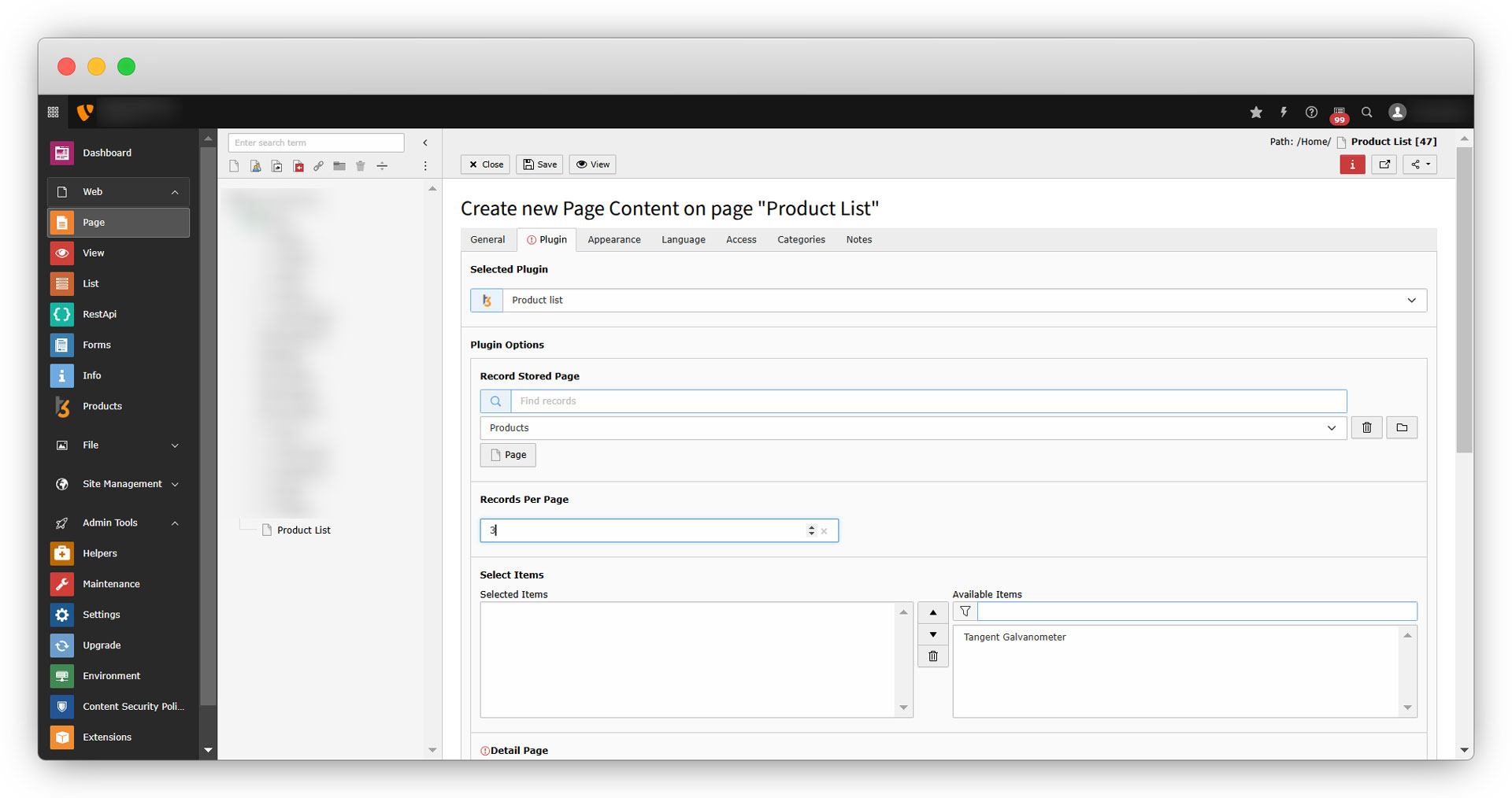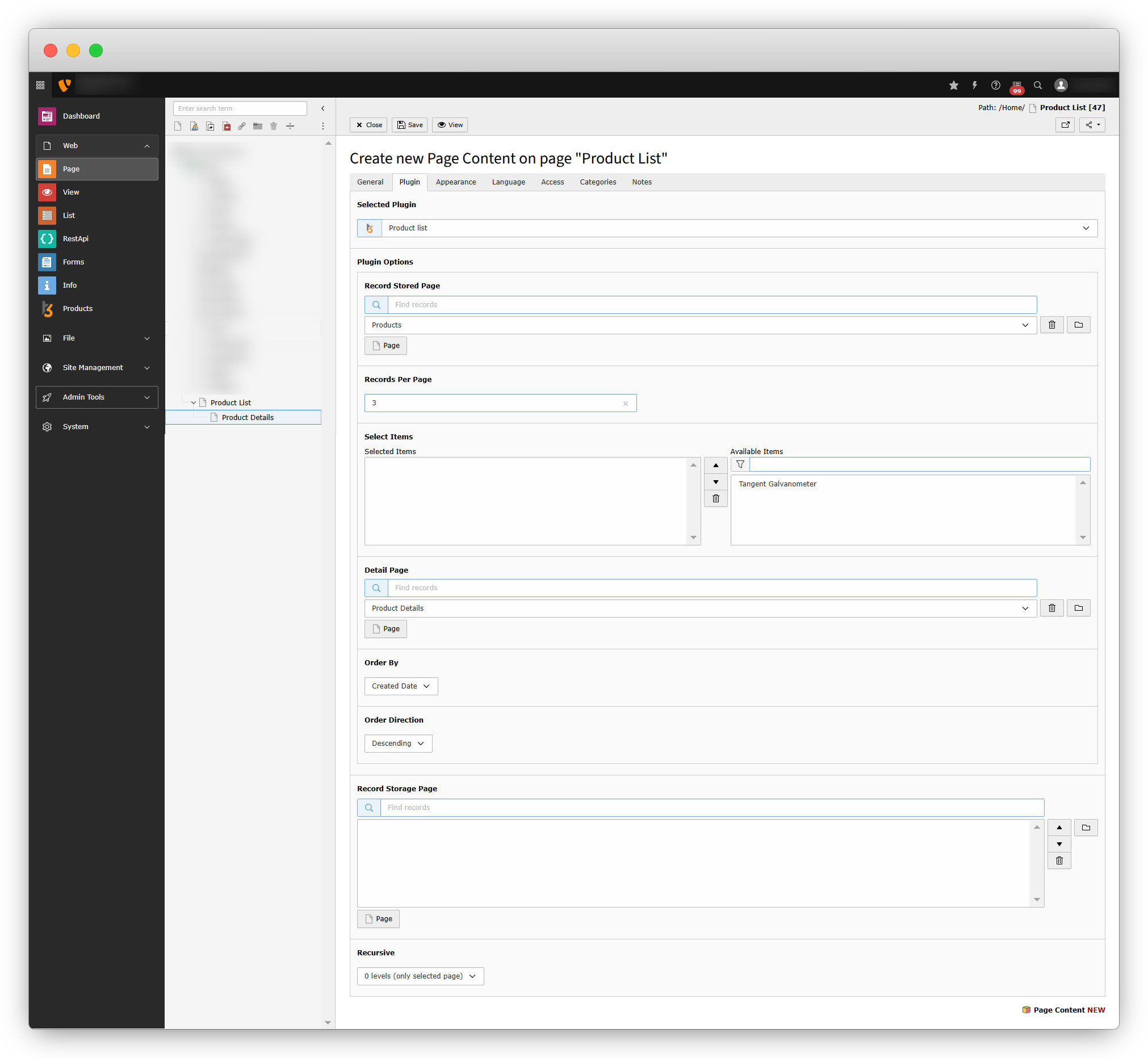 7. As you can see in the above screenshot, in “Plugin Options” it is required to add the “Record Stored Page”. Click on the “Page” button and select the folder you have stored your records in. Here the folder is “Products”.