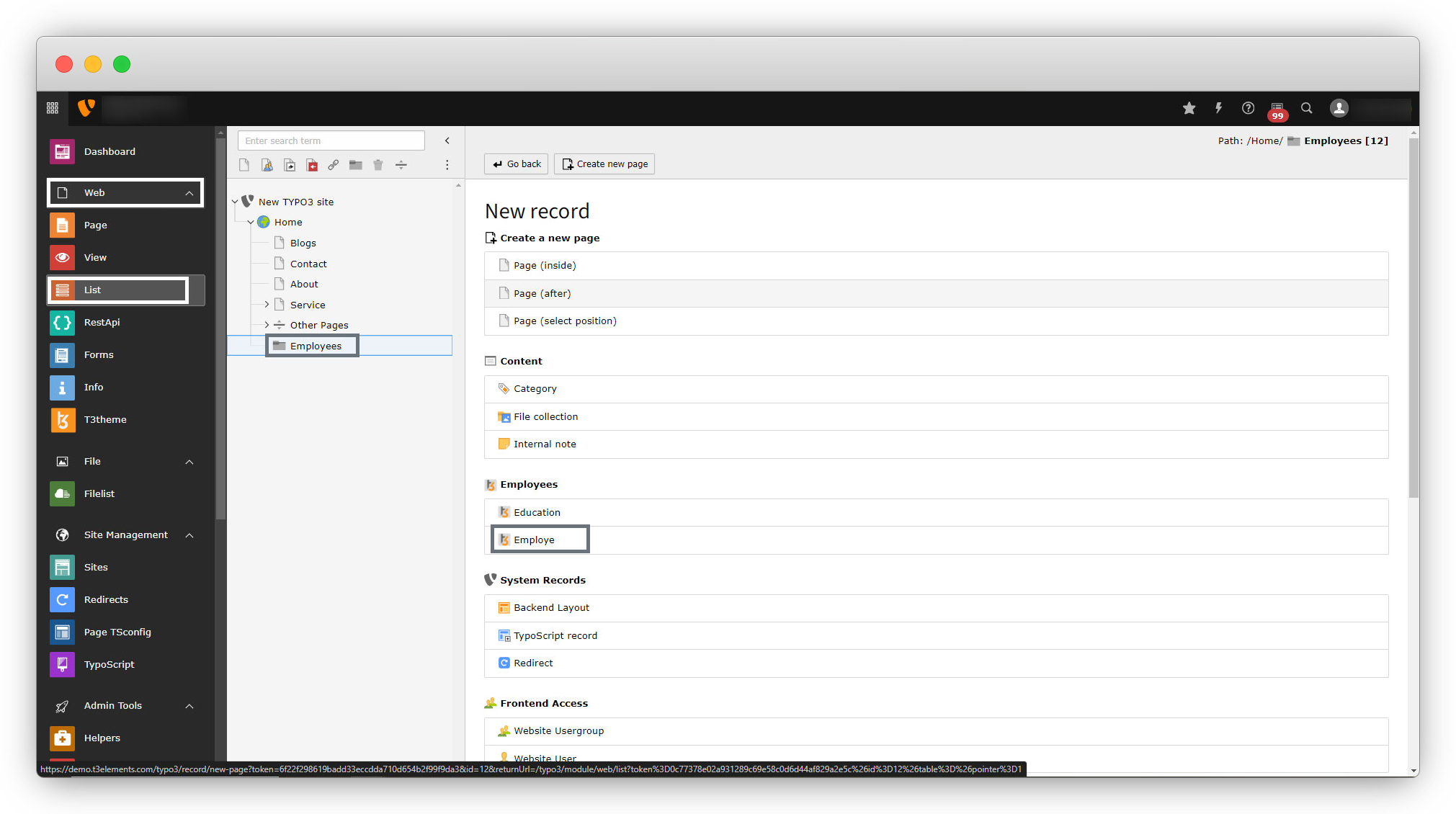 To create a new record, go to Web > List > Select the folder Or create the folder where you want to store your records for employees and then click on the “+Create new record” button and select Employe and you will see the form for the employee.