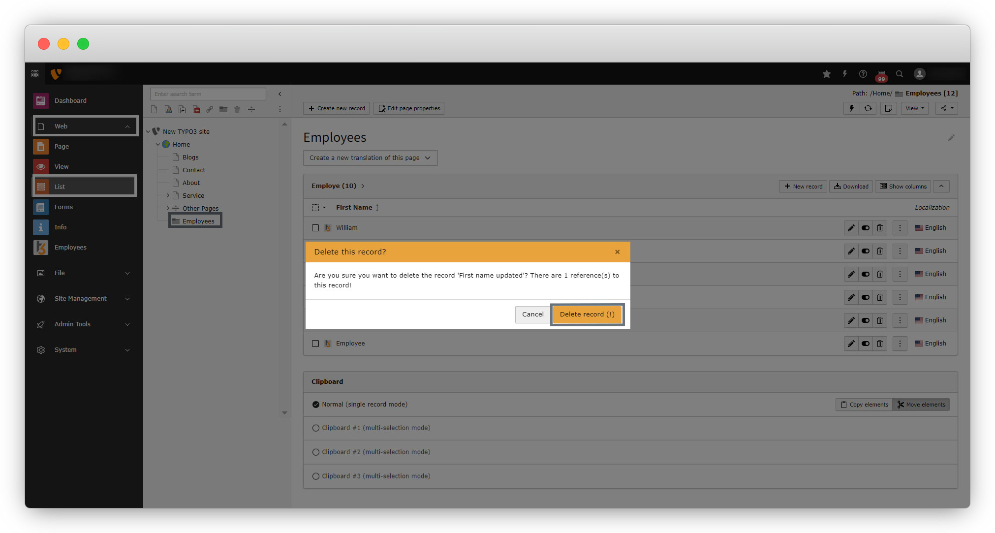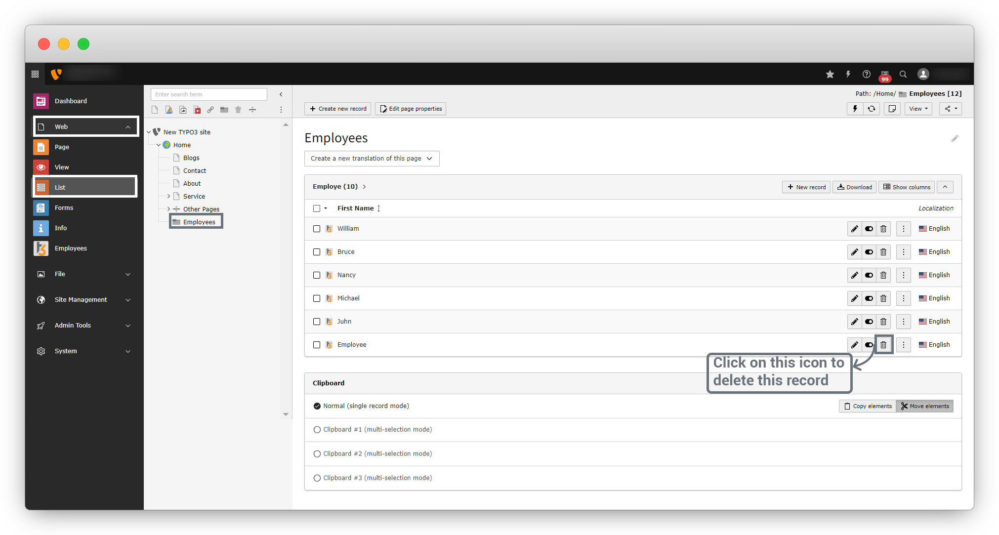 To delete a particular record, go to Web > List > Select the folder from which you want to delete the record and you will see the list of the records. Then click on the delete icon for that particular record, then confirm that you want to delete the record and that record will be deleted.