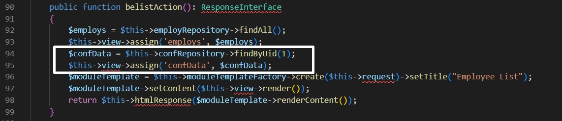 Below are the screenshots from the employeeClassesControllerEmployController.php file of the updated data for the table tx_employee_domain_model_conf.