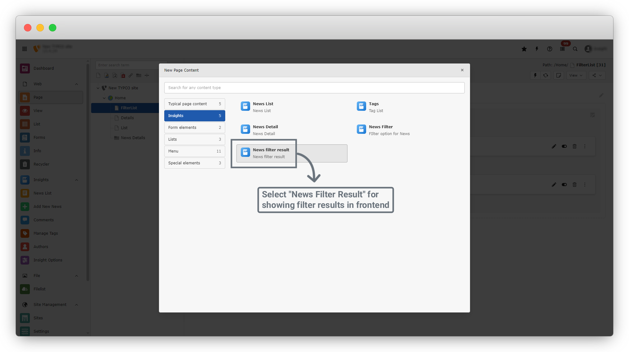 1. Similar to Tags, create a News Filter Result content by clicking on “+ Create New Content”. A dialog box will open.