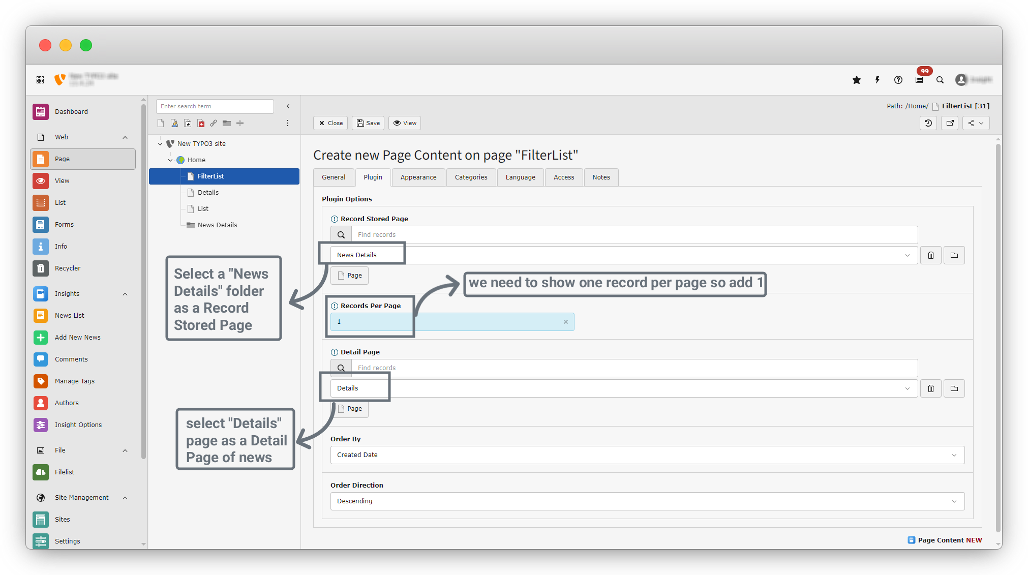 - Record Stored Page: Select the page where records are stored. In our case, records are stored in the “News Details” folder.