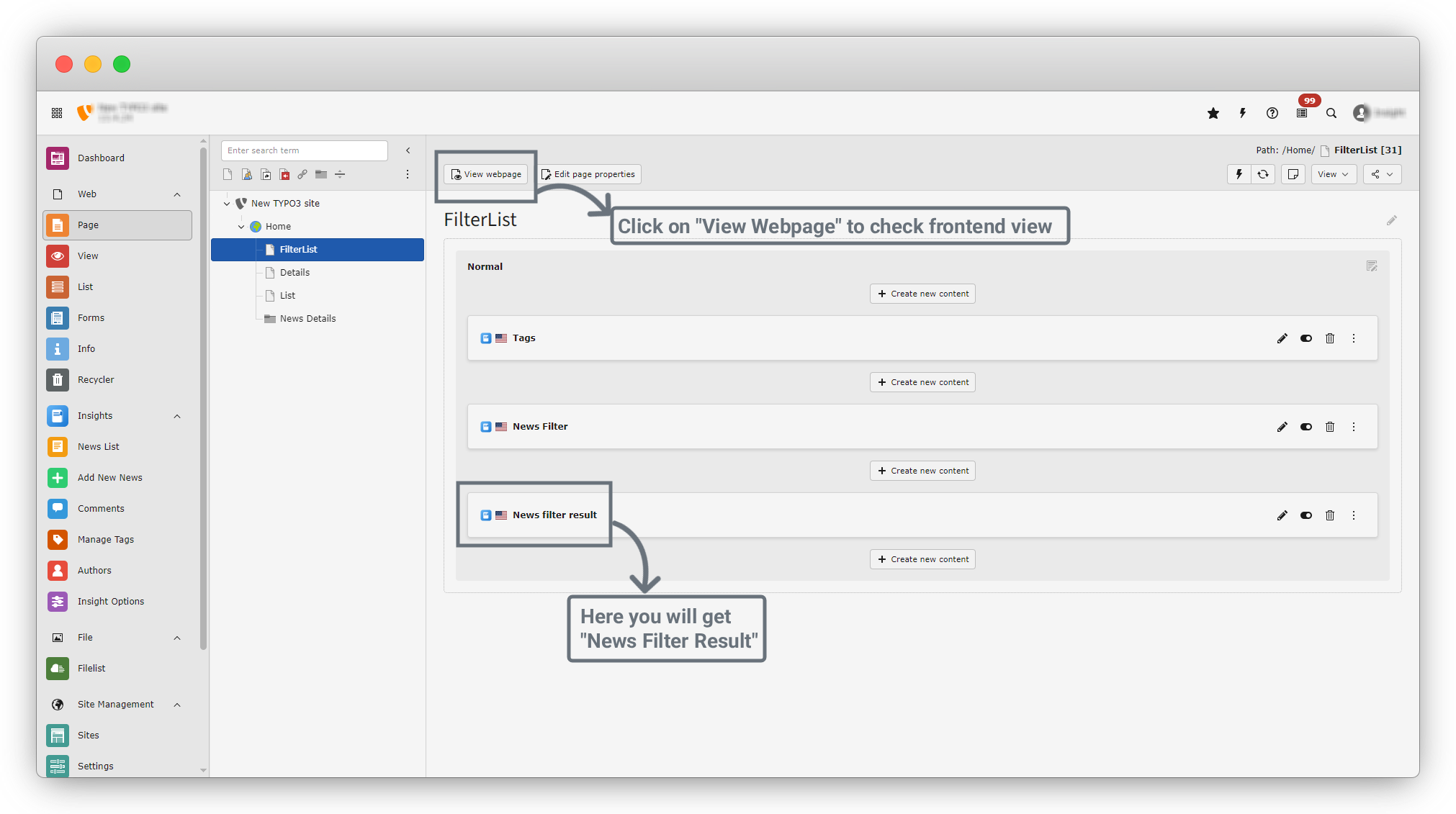 8. After clicking the Close button, you will be redirected back to the Filter List page. On this page, the newly created News Filter Result content will be listed below the News Filter content.