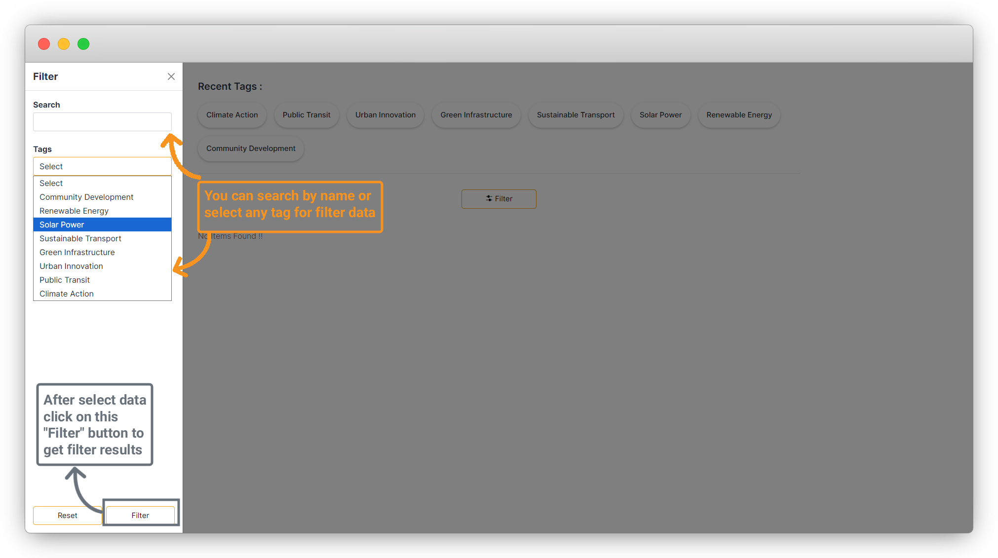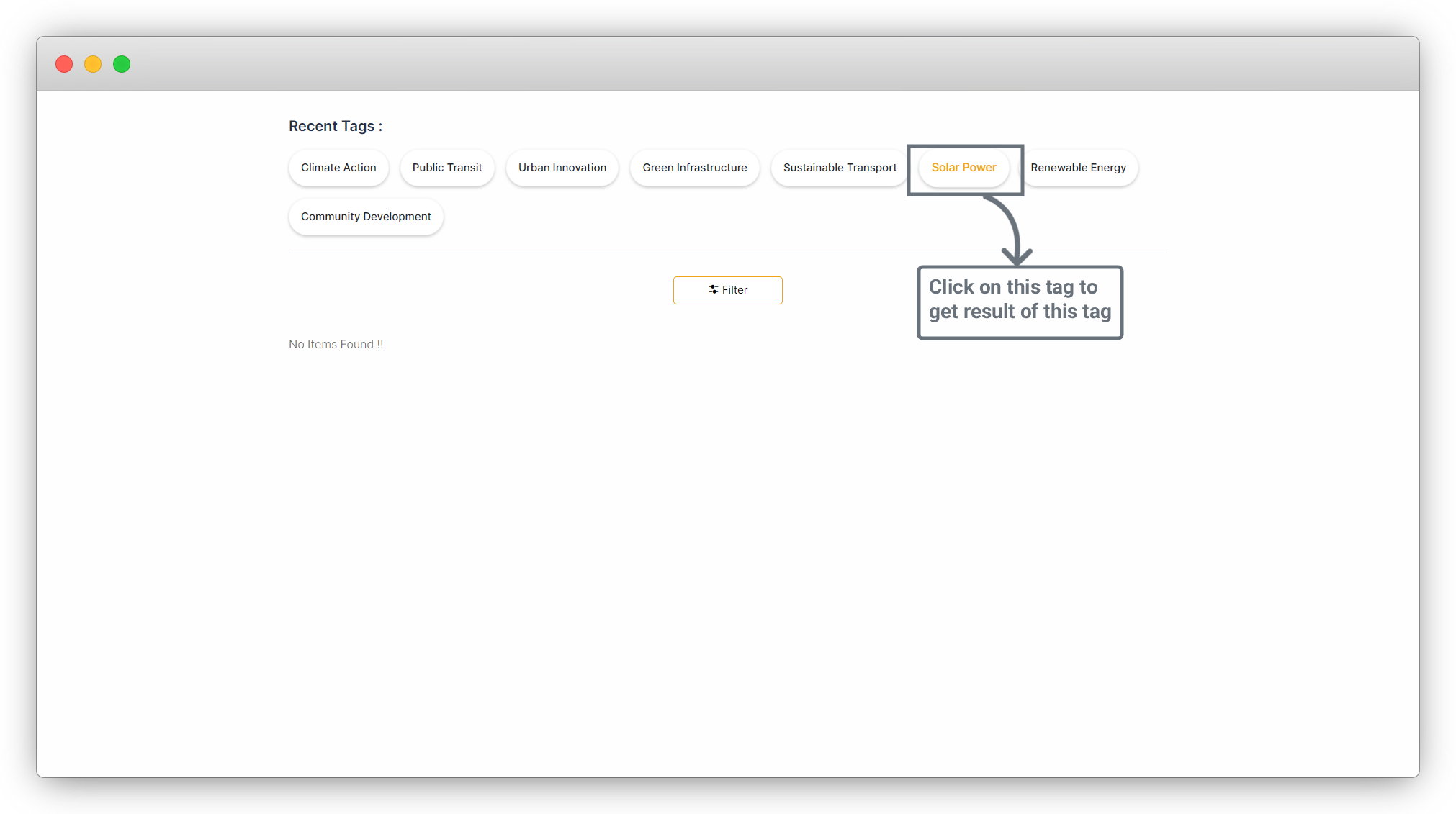 12. Next, test the Filter button. Click the Filter button, and a sidebar will appear containing a search bar and a tags dropdown. You can search using any keyword or filter by tag. After selecting your criteria, click the Filter button at the bottom to view the filtered results.