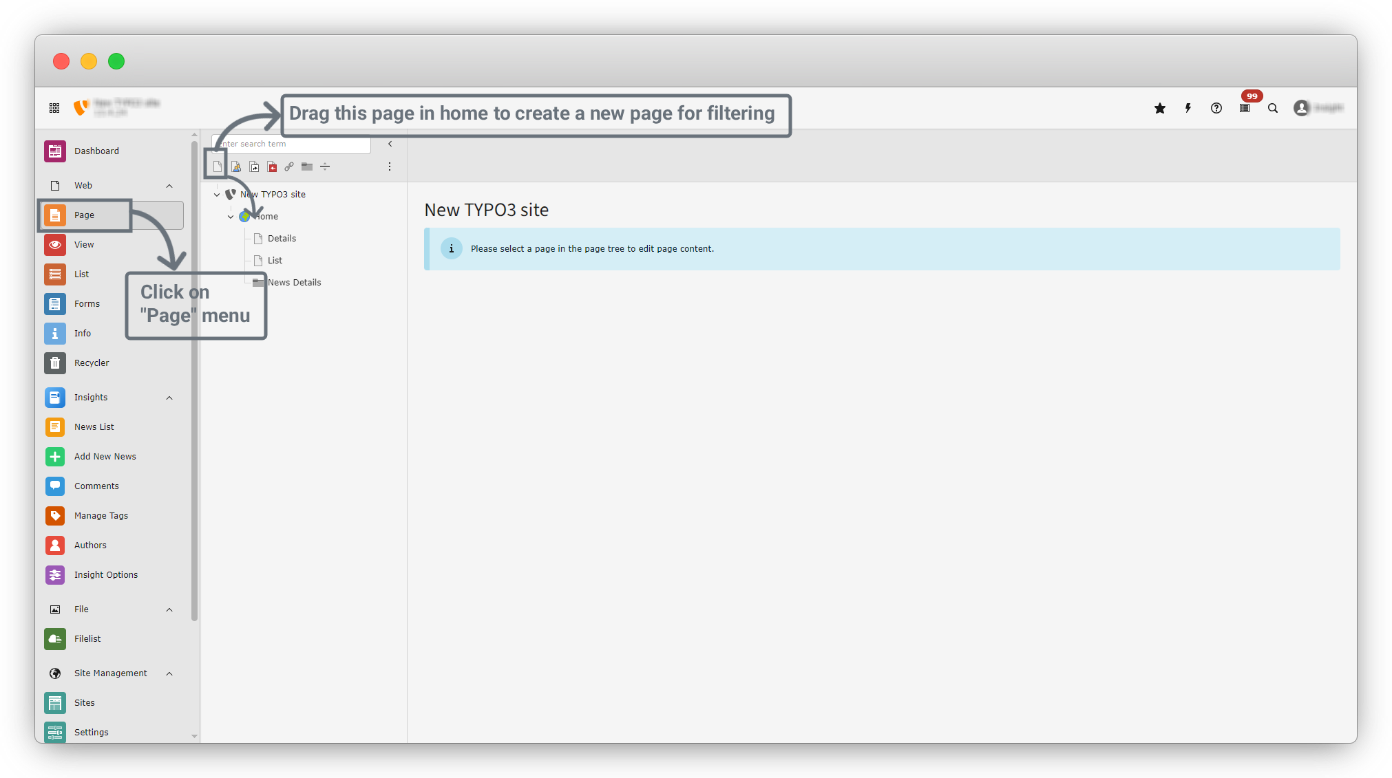 1. Open the “Page” menu from the sidebar and create a new page.