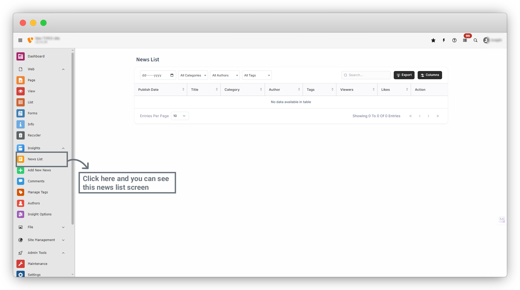 Click on Insight in the left sidebar. You will see the first option, “News List,” which allows you to manage your news. Click on News List, and the News List screen will open.