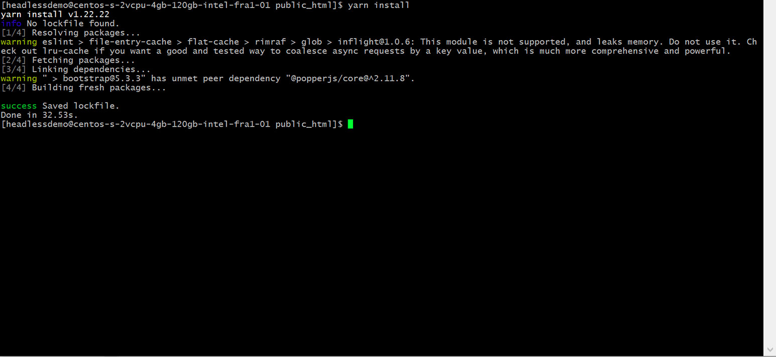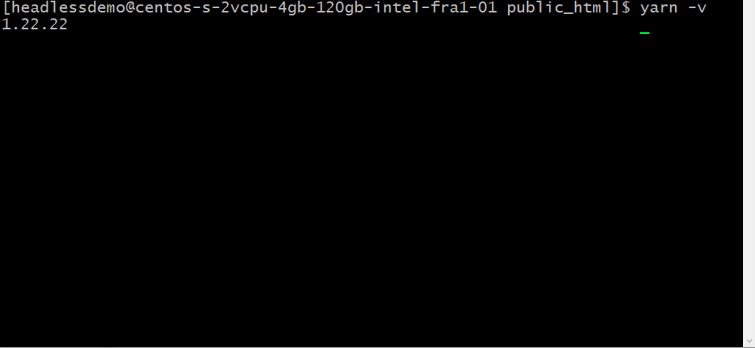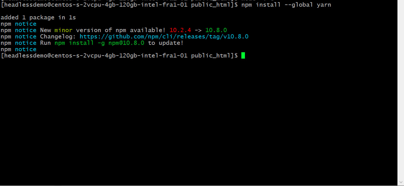 3.2 If yarn is not installed in your server, you can install yarn with this command: npm install –global yarn and you will get the output like this.