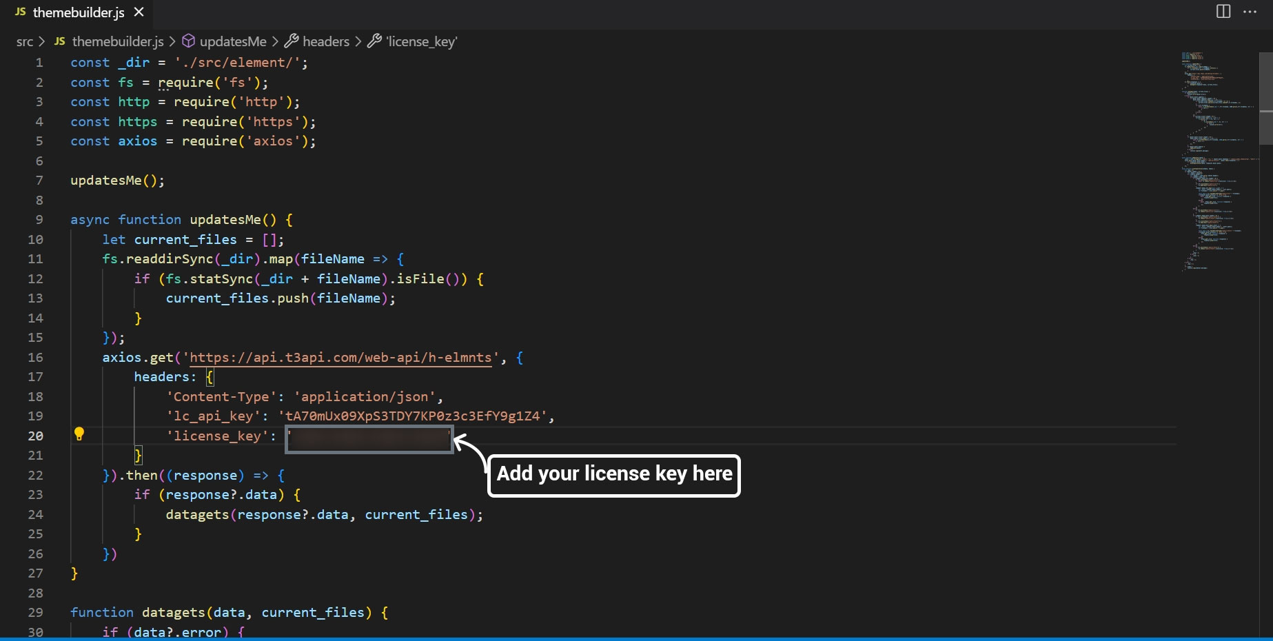 3.4.1 Please open the file themebuilder.js from the provided folder. The file is located in the src folder: srcthemebuilder.js and add your license key. Please check “t3headless Activation” to see how to get the license key.