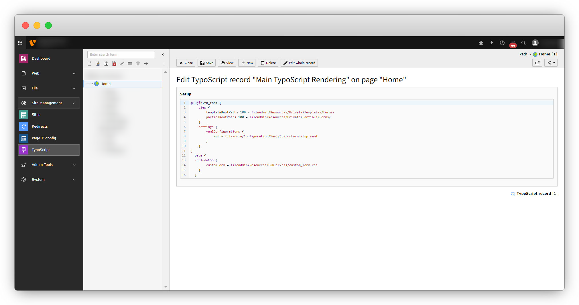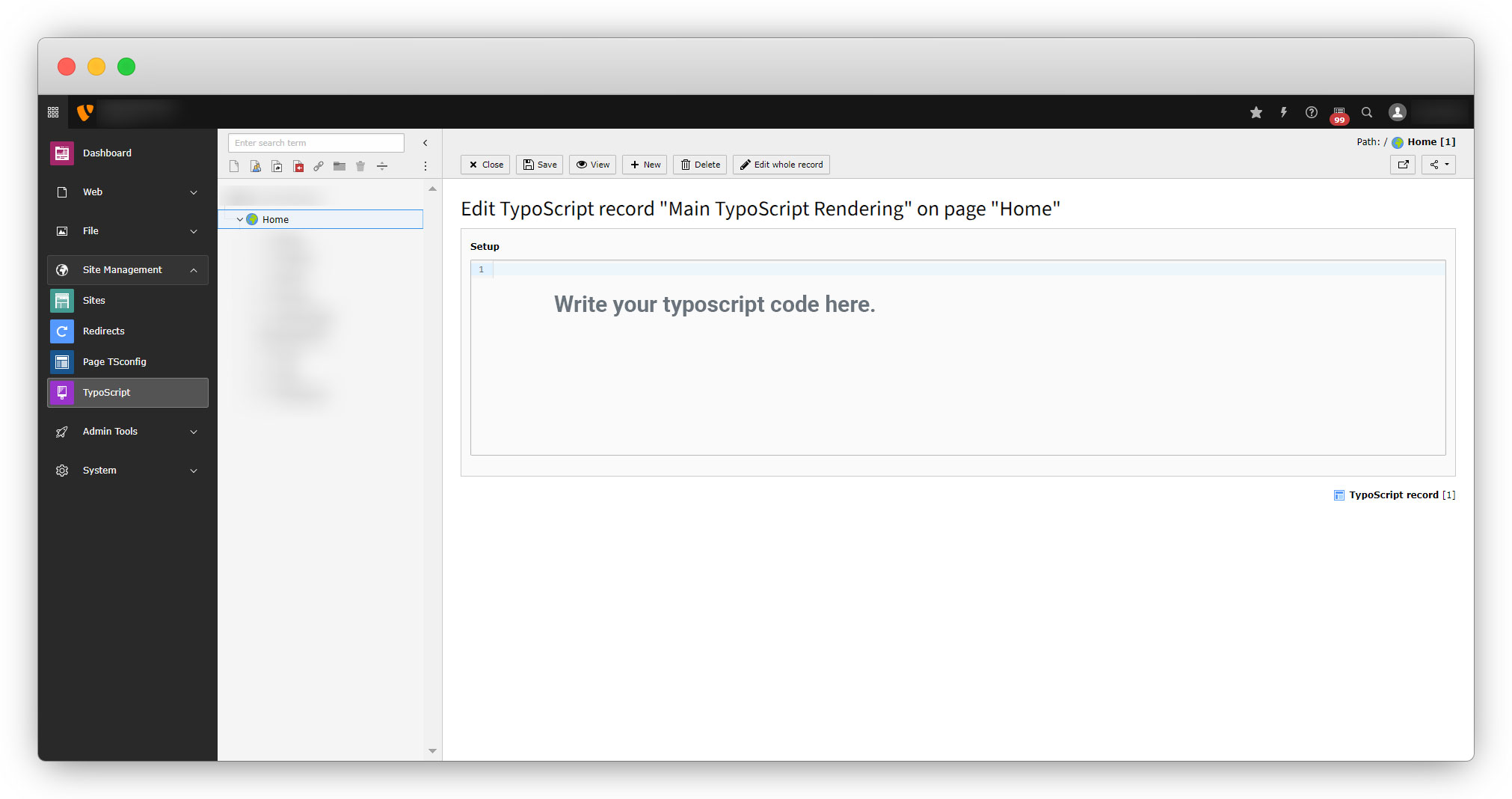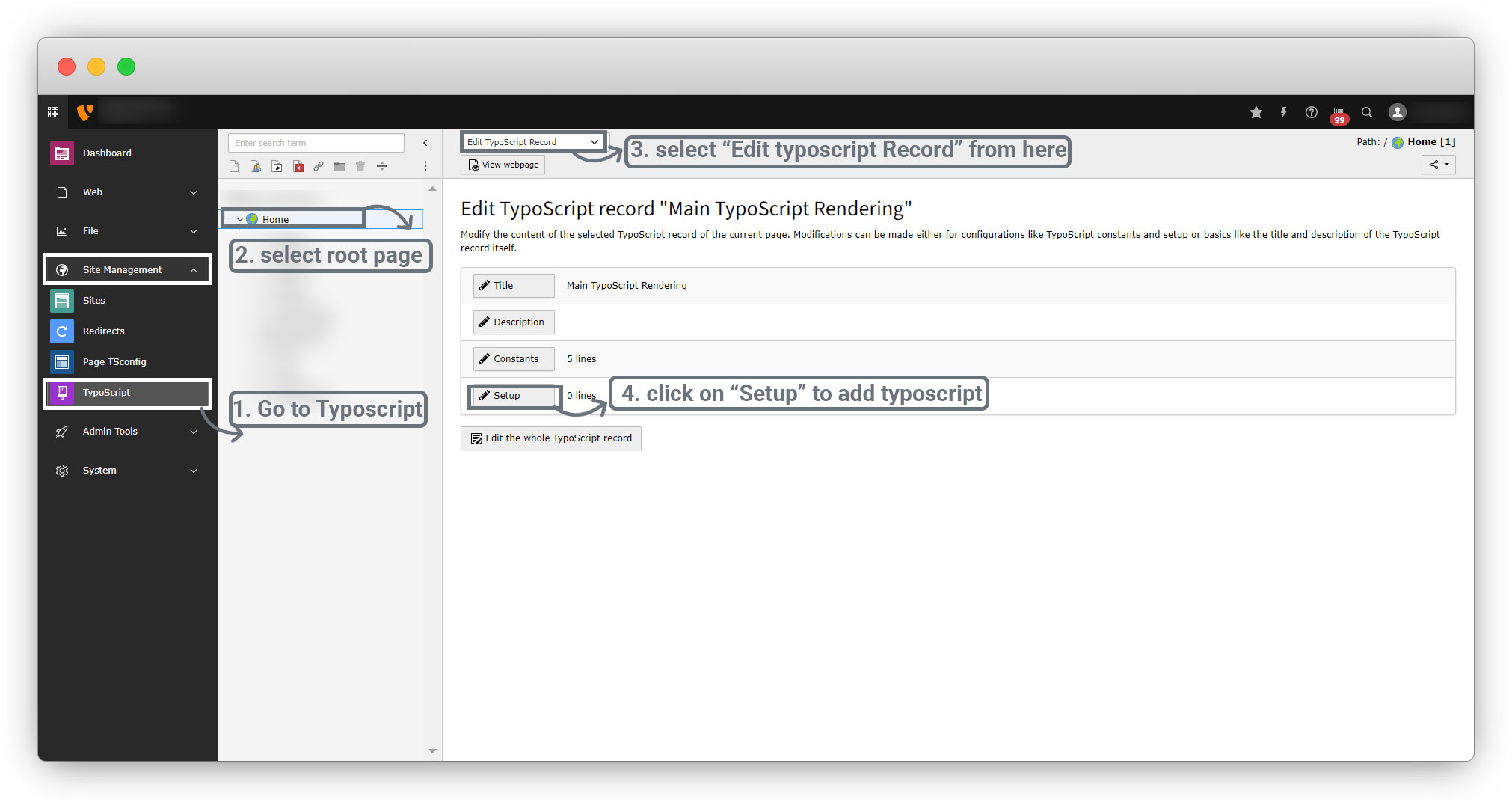 4. Typoscript: You will have to write the typoscript in the admin panel. Open the TYPO3 admin panel, go to Site Management > Typoscript, select the root page and select the “Edit Typoscript Record” option and click on the “Setup”.
