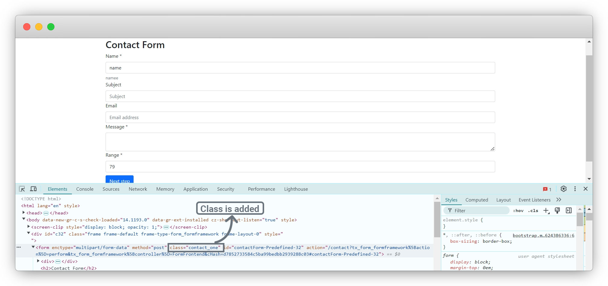 6. Now check your front-end and inspect the element and you will see the class has been added to the form.