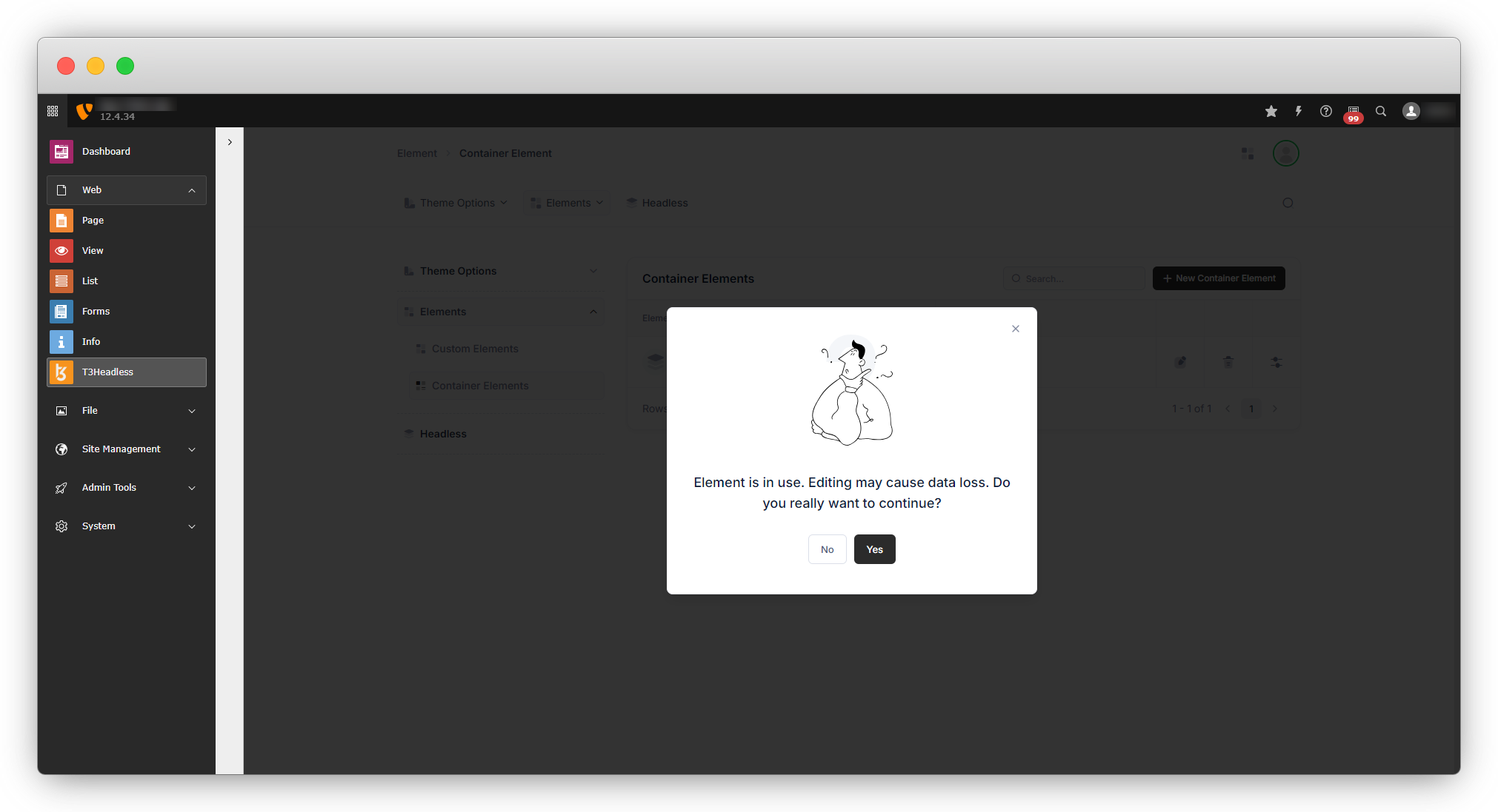 4.1. When you edit any element that is already in use, you will see a dialogue like this: