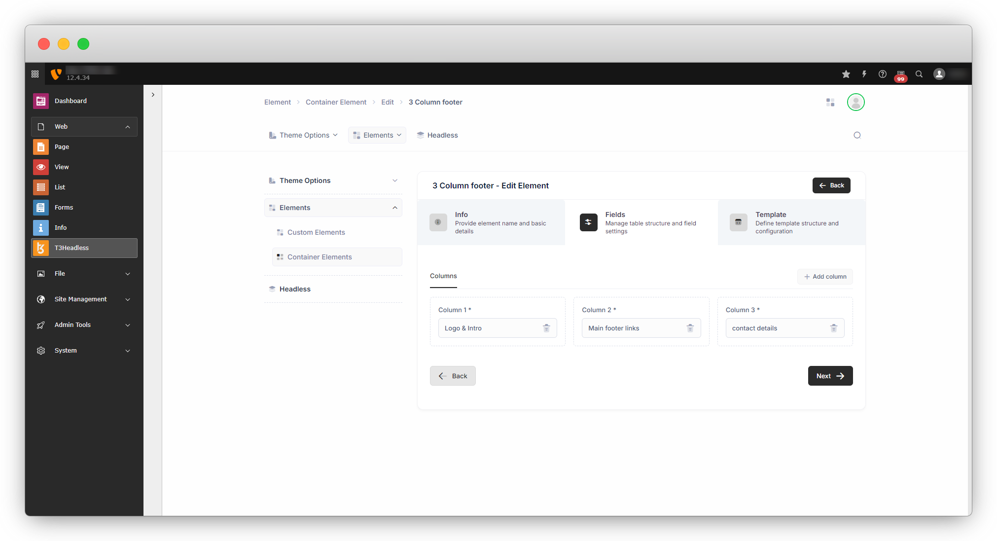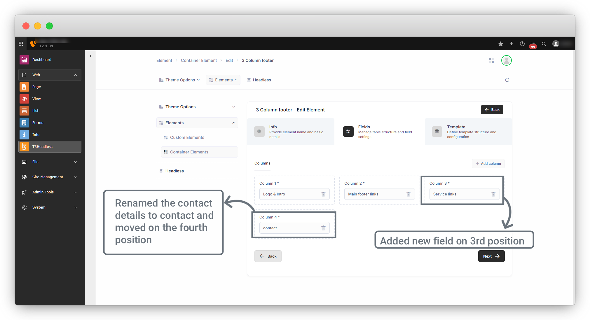 4.2. Go ahead by clicking on Yes, and you will see all the 3 tabs you saw at the time of element creation which are info, field, and template.